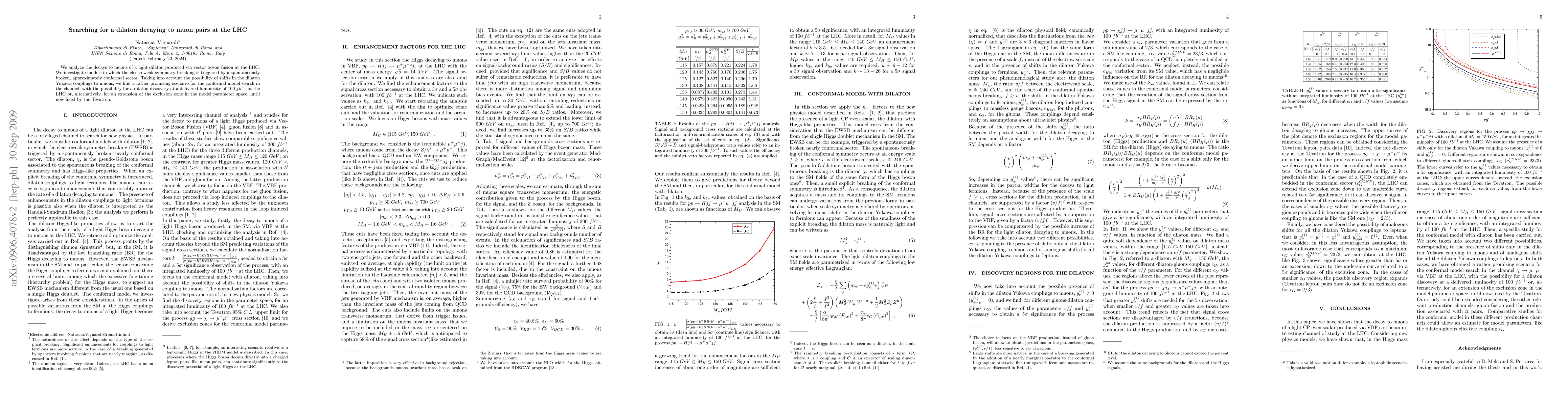 We analyze the decays to muons of a light dilaton produced via vector boson fusion at the LHC. We investigate models in which the electroweak symmetry breaking is triggered by a spontaneously broken, approximately conformal sector. Taking into account the possibility of shifts in the dilaton Yukawa couplings to muons, we find a rather promising scenario for the conformal model search in the channel, with the possibility for a dilaton discovery at a delivered luminosity of 100 fb-1 at the LHC or, alternatively, for an extension of the exclusion zone in the model parameter space, until now fixed by the Tevatron.