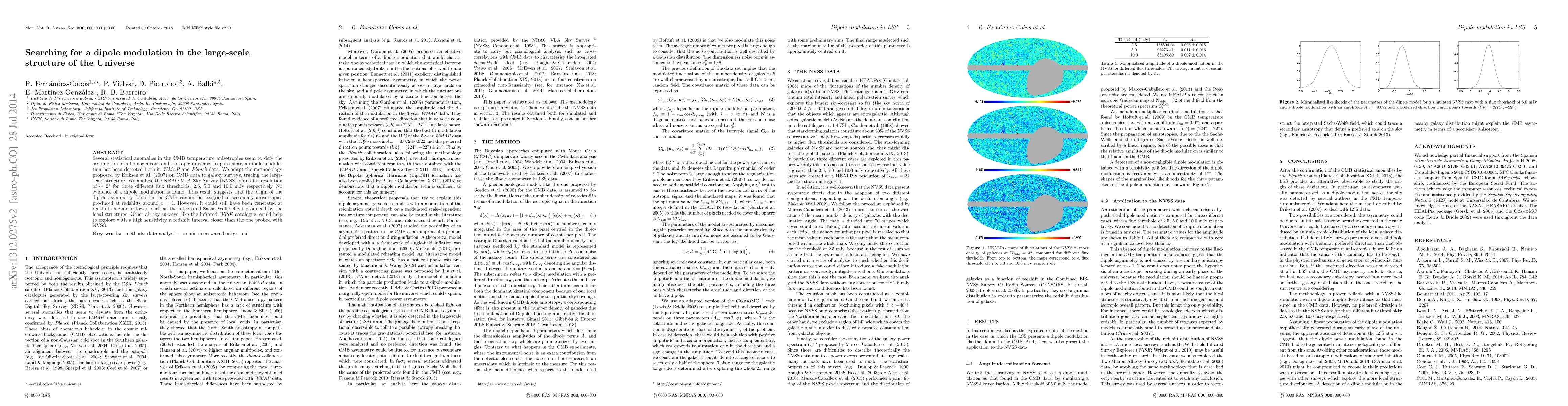 Several statistical anomalies in the CMB temperature anisotropies seem to defy the assumption of a homogeneous and isotropic universe. In particular, a dipole modulation has been detected both in WMAP and Planck data. We adapt the methodology proposed by Eriksen et al. (2007) on CMB data to galaxy surveys, tracing the large-scale structure. We analyse the NRAO VLA Sky Survey (NVSS) data at a resolution of ~2 degrees for three different flux thresholds: 2.5, 5.0 and 10.0 mJy respectively. No evidence of a dipole modulation is found. This result suggests that the origin of the dipole asymmetry found in the CMB cannot be assigned to secondary anisotropies produced at redshifts around z = 1. However, it could still have been generated at redshifts higher or lower, such as the integrated Sachs-Wolfe effect produced by the local structures. Other all-sky surveys, like the infrared WISE catalogue, could help to explore with a high sensitivity a redshift interval closer than the one probed with NVSS.