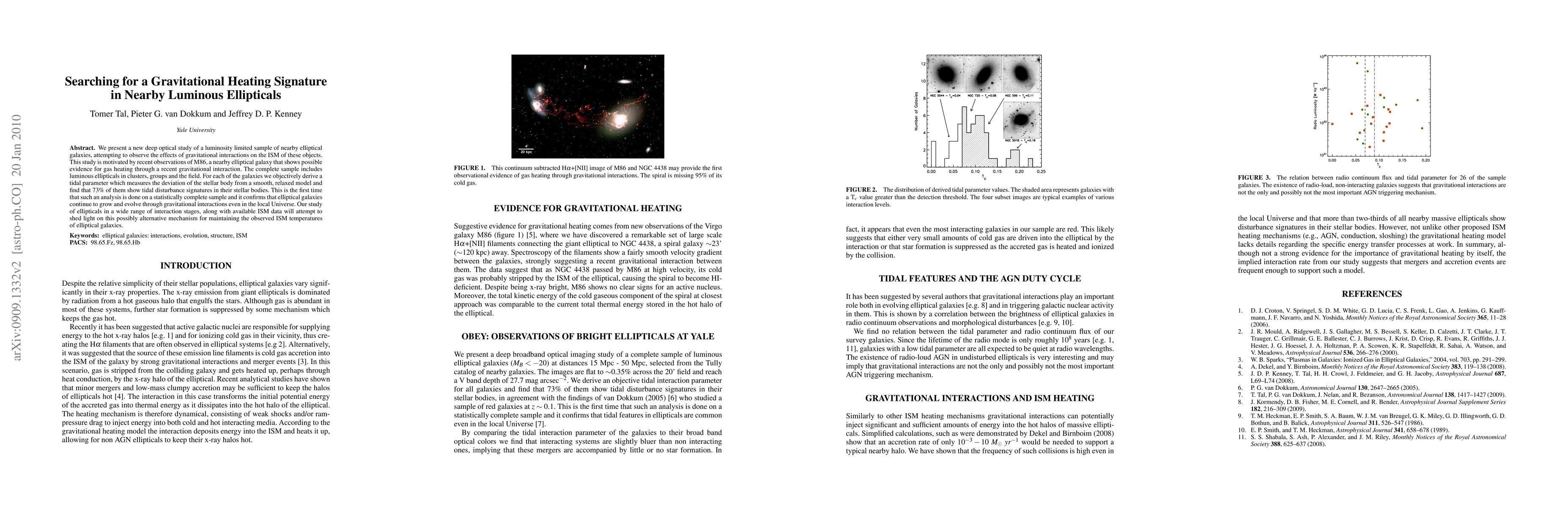 This study investigates the gravitational heating effects in nearby luminous elliptical galaxies, finding tidal disturbances in 73% of them, suggesting ongoing growth and evolution through gravitational interactions. The research aims to explore an alternative mechanism for maintaining the ISM temperatures in these galaxies.