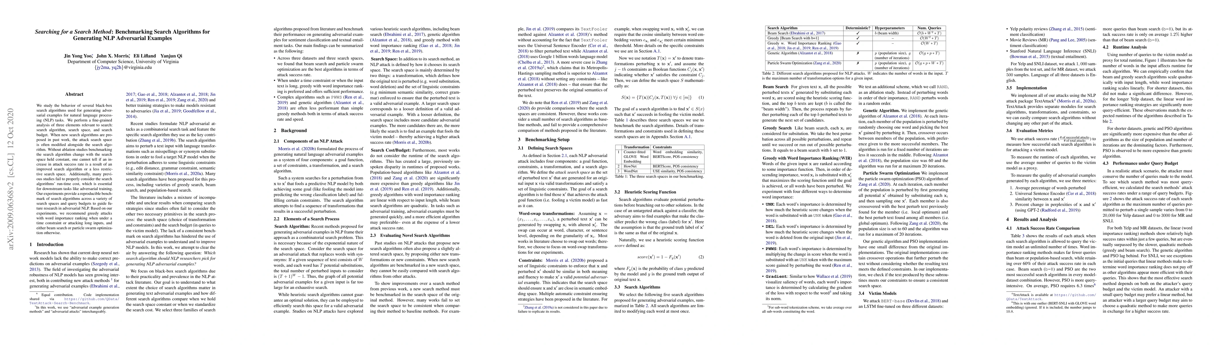 This paper benchmarks various black-box search algorithms for generating NLP adversarial examples, analyzing the impact of search algorithm, search space, and budget. It recommends greedy attacks with word importance ranking for time-constrained scenarios and either beam search or particle swarm optimization for other cases.