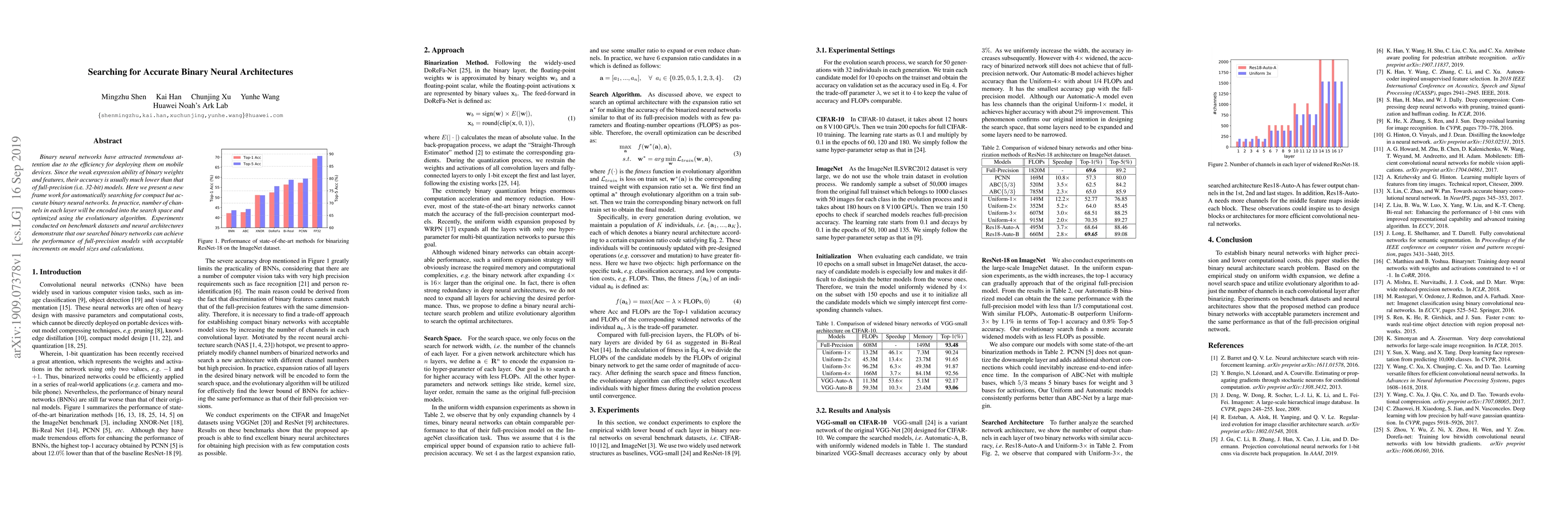 This paper proposes a new framework for automatically searching for compact yet accurate binary neural networks, optimizing channel configurations using an evolutionary algorithm to achieve performance comparable to full-precision models with minimal increases in model size and computational cost. Experiments on benchmark datasets show promising results.