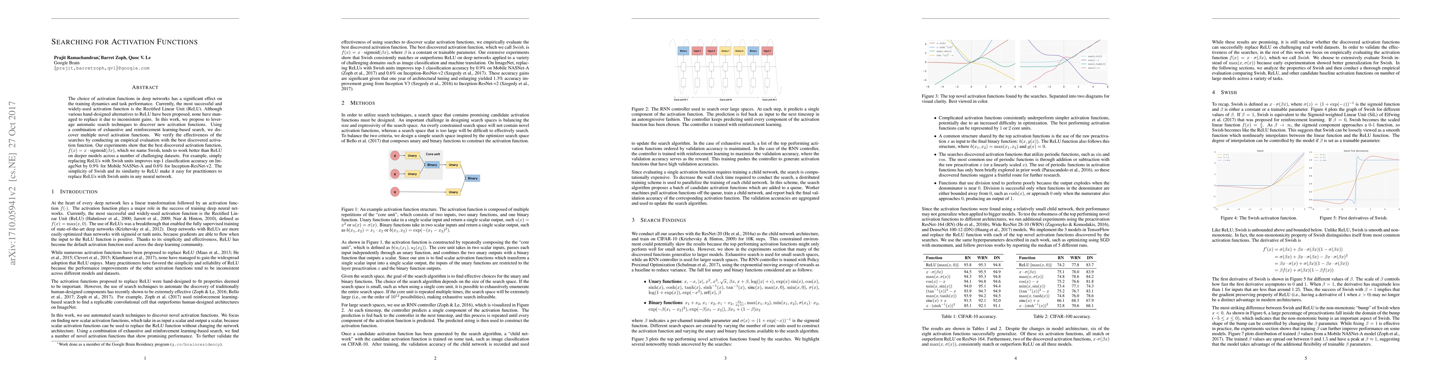 The choice of activation functions in deep networks has a significant effect on the training dynamics and task performance. Currently, the most successful and widely-used activation function is the Rectified Linear Unit (ReLU). Although various hand-designed alternatives to ReLU have been proposed, none have managed to replace it due to inconsistent gains. In this work, we propose to leverage automatic search techniques to discover new activation functions. Using a combination of exhaustive and reinforcement learning-based search, we discover multiple novel activation functions. We verify the effectiveness of the searches by conducting an empirical evaluation with the best discovered activation function. Our experiments show that the best discovered activation function, $f(x) = x \cdot \text{sigmoid}(\beta x)$, which we name Swish, tends to work better than ReLU on deeper models across a number of challenging datasets. For example, simply replacing ReLUs with Swish units improves top-1 classification accuracy on ImageNet by 0.9\% for Mobile NASNet-A and 0.6\% for Inception-ResNet-v2. The simplicity of Swish and its similarity to ReLU make it easy for practitioners to replace ReLUs with Swish units in any neural network.
