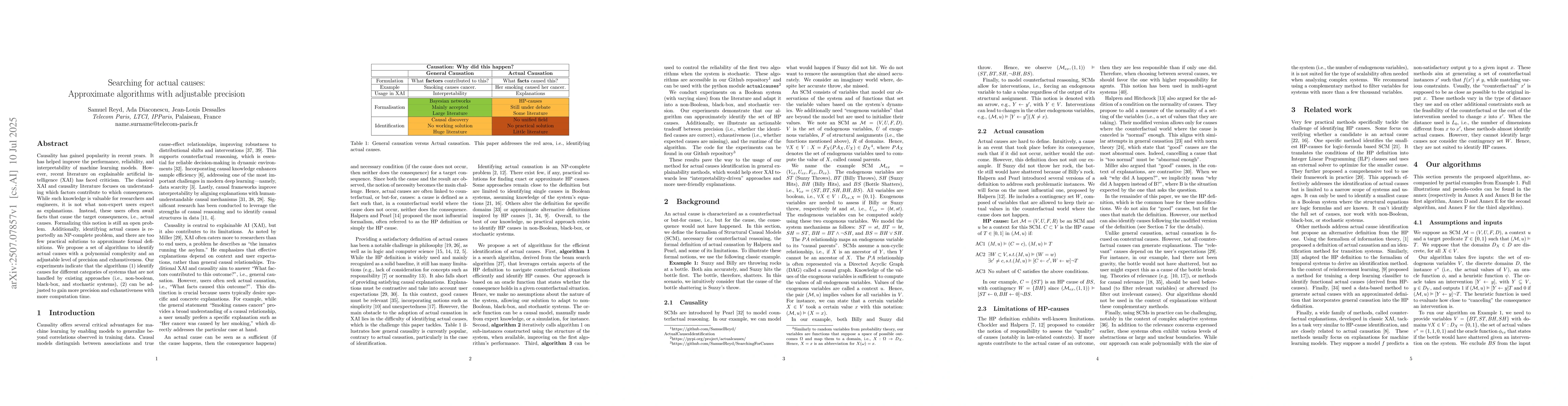 Causality has gained popularity in recent years. It has helped improve the performance, reliability, and interpretability of machine learning models. However, recent literature on explainable artificial intelligence (XAI) has faced criticism. The classical XAI and causality literature focuses on understanding which factors contribute to which consequences. While such knowledge is valuable for researchers and engineers, it is not what non-expert users expect as explanations. Instead, these users often await facts that cause the target consequences, i.e., actual causes. Formalizing this notion is still an open problem. Additionally, identifying actual causes is reportedly an NP-complete problem, and there are too few practical solutions to approximate formal definitions. We propose a set of algorithms to identify actual causes with a polynomial complexity and an adjustable level of precision and exhaustiveness. Our experiments indicate that the algorithms (1) identify causes for different categories of systems that are not handled by existing approaches (i.e., non-boolean, black-box, and stochastic systems), (2) can be adjusted to gain more precision and exhaustiveness with more computation time.