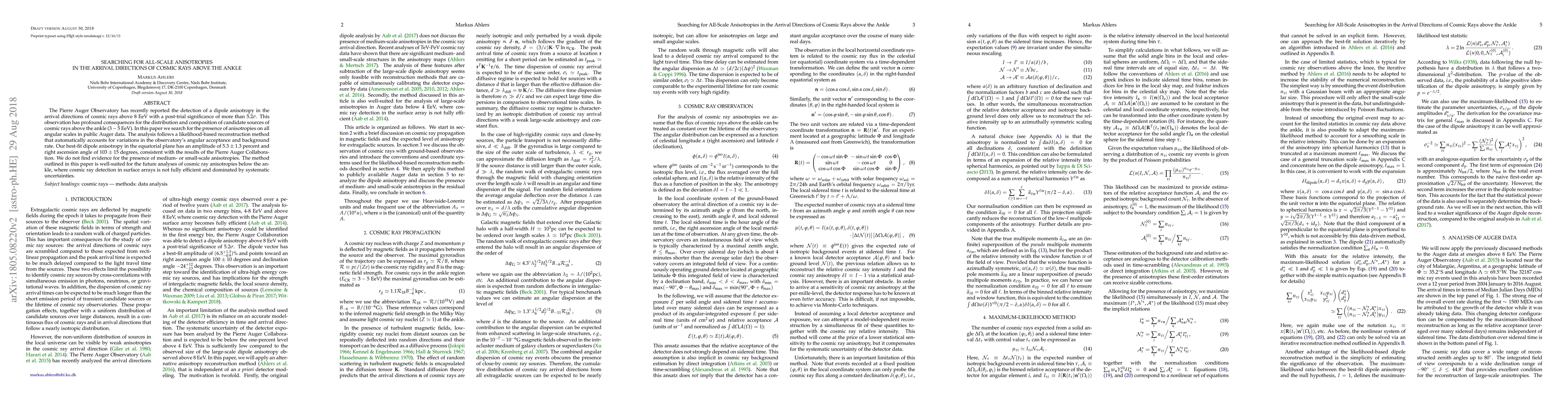 The Pierre Auger Observatory has recently reported the detection of a dipole anisotropy in the arrival directions of cosmic rays above 8 EeV with a post-trial significance of more than 5.2$\sigma$. This observation has profound consequences for the distribution and composition of candidate sources of cosmic rays above the ankle (3-5 EeV). In this paper we search for the presence of anisotropies on all angular scales in public Auger data. The analysis follows a likelihood-based reconstruction method that automatically accounts for variations in the observatory's angular acceptance and background rate. Our best-fit dipole anisotropy in the equatorial plane has an amplitude of 5.3 $\pm$ 1.3 percent and right ascension angle of 103 $\pm$ 15 degrees, consistent with the results of the Pierre Auger Collaboration. We do not find evidence for the presence of medium- or small-scale anisotropies. The method outlined in this paper is well-suited for the future analyses of cosmic ray anisotropies below the ankle, where cosmic ray detection in surface arrays is not fully efficient and dominated by systematic uncertainties.