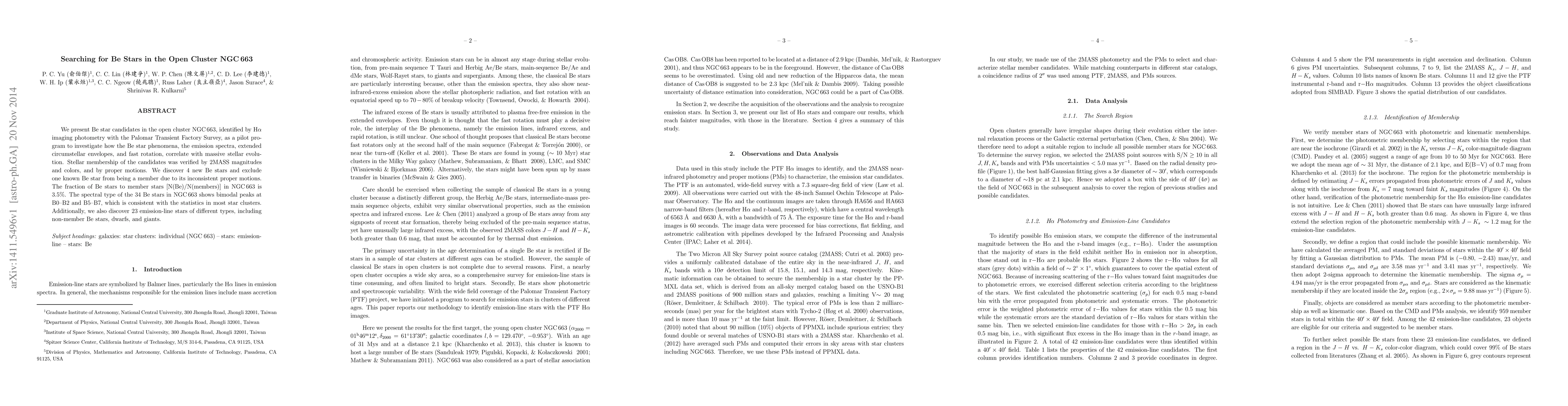We present Be star candidates in the open cluster NGC\,663, identified by H$\alpha$ imaging photometry with the Palomar Transient Factory Survey, as a pilot program to investigate how the Be star phenomena, the emission spectra, extended circumstellar envelopes, and fast rotation, correlate with massive stellar evolution. Stellar membership of the candidates was verified by 2MASS magnitudes and colors, and by proper motions. We discover 4 new Be stars and exclude one known Be star from being a member due to its inconsistent proper motions. The fraction of Be stars to member stars [N(Be)/N(members)] in NGC\,663 is 3.5\%. The spectral type of the 34 Be stars in NGC\,663 shows bimodal peaks at B0--B2 and B5--B7, which is consistent with the statistics in most star clusters. Additionally, we also discover 23 emission-line stars of different types, including non-member Be stars, dwarfs, and giants.