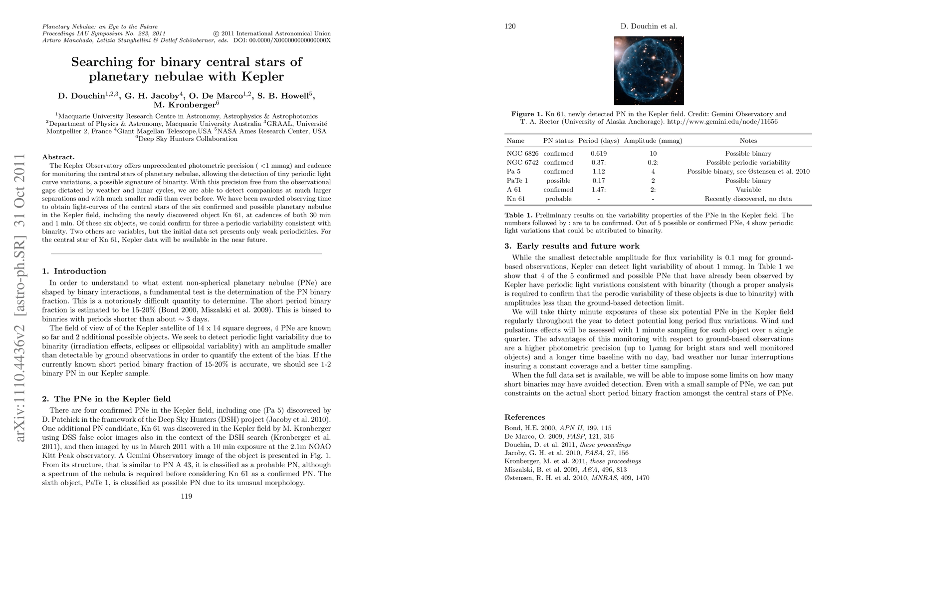 The Kepler Observatory detects binarity in 3 out of 6 planetary nebulae using high-precision photometric monitoring, offering new insights into the central stars of these objects.