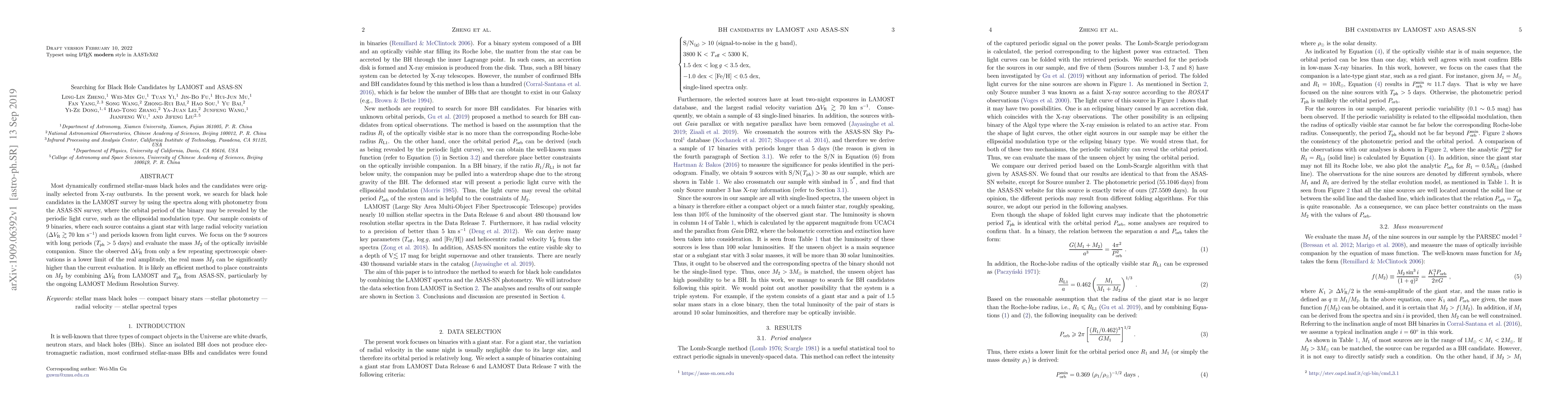 This paper searches for stellar-mass black hole candidates using spectra from LAMOST and photometry from ASAS-SN, focusing on 9 binaries with giant stars and long orbital periods. The study evaluates the mass of the invisible companion, suggesting that combining radial velocity data and light curve periods can provide more accurate mass estimates.