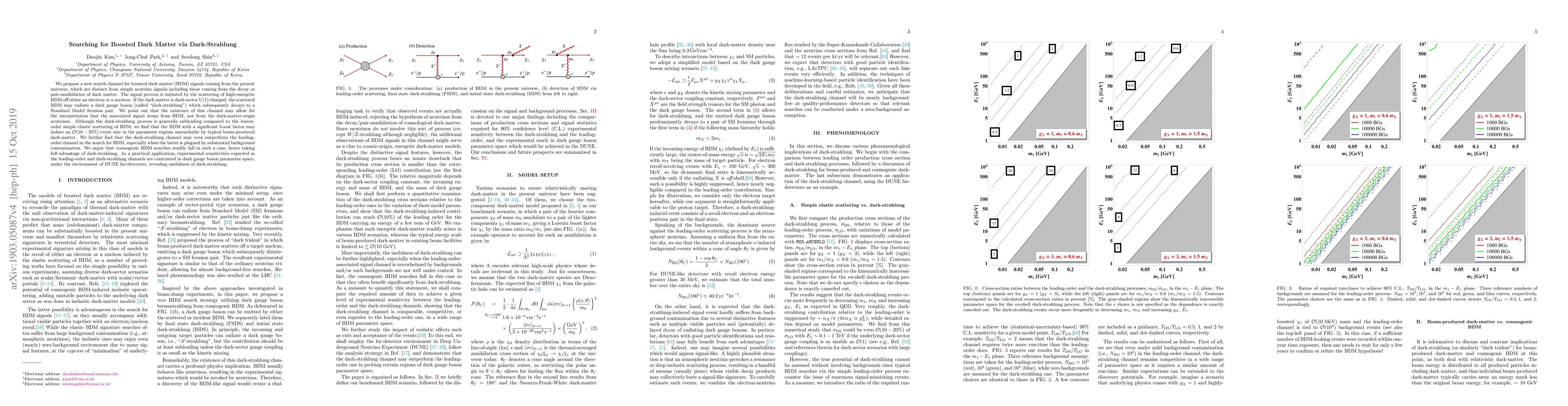 We propose a new search channel for boosted dark matter (BDM) signals coming from the present universe, which are distinct from simple neutrino signals including those coming from the decay or pair-annihilation of dark matter. The signal process is initiated by the scattering of high-energetic BDM off either an electron or a nucleon. If the dark matter is dark-sector U(1)-charged, the scattered BDM may radiate a dark gauge boson (called "dark-strahlung") which subsequently decays to a Standard Model fermion pair. We point out that the existence of this channel may allow for the interpretation that the associated signal stems from BDM, not from the dark-matter-origin neutrinos. Although the dark-strahlung process is generally subleading compared to the lowest-order simple elastic scattering of BDM, we find that the BDM with a significant boost factor may induce an O(10-20%) event rate in the parameter regions unreachable by typical beam-produced dark-matter. We further find that the dark-strahlung channel may even outperform the leading-order channel in the search for BDM, especially when the latter is plagued by substantial background contamination. We argue that cosmogenic BDM searches readily fall in such a case, hence taking full advantage of dark-strahlung. As a practical application, experimental sensitivities expected in the leading-order and dark-strahlung channels are contrasted in dark gauge boson parameter space, under the environment of DUNE far-detectors, revealing usefulness of dark-strahlung.
