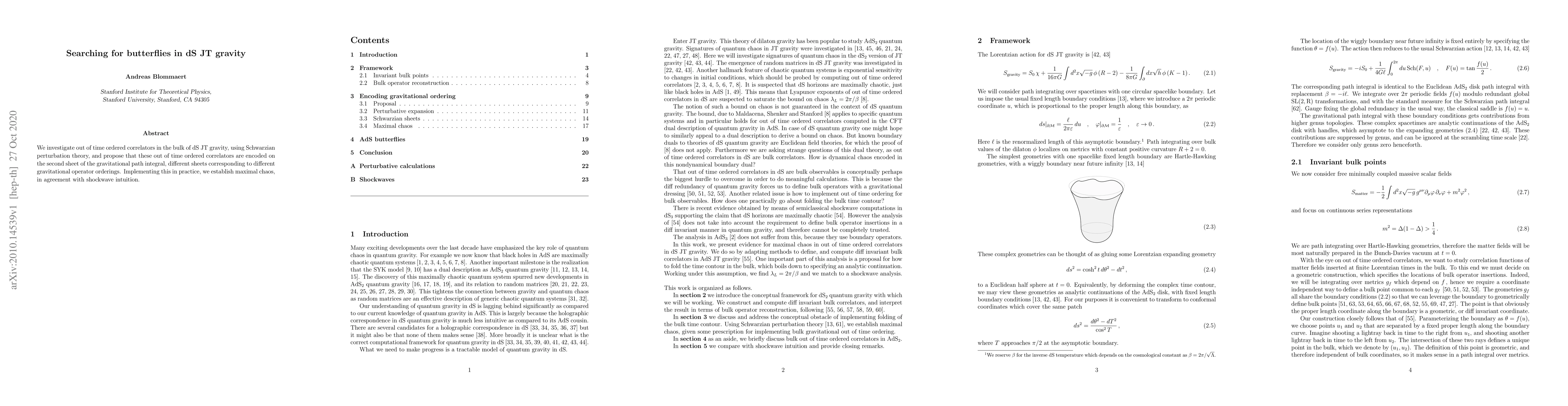We investigate out of time ordered correlators in the bulk of dS JT gravity, using Schwarzian perturbation theory, and propose that these out of time ordered correlators are encoded on the second sheet of the gravitational path integral, different sheets corresponding to different gravitational operator orderings. Implementing this in practice, we establish maximal chaos, in agreement with shockwave intuition.