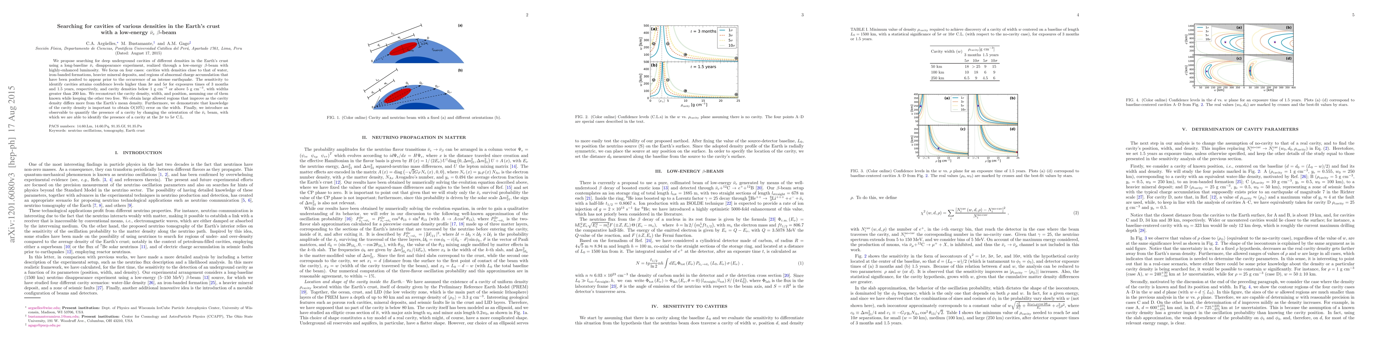 We propose searching for deep underground cavities of different densities in the Earth's crust using a long-baseline electron-antineutrino disappearance experiment, realized through a low-energy beta-beam with highly-enhanced luminosity. We focus on four cases: cavities with densities close to that of water, iron-banded formations, heavier mineral deposits, and regions of abnormal charge accumulation that have been posited to appear prior to the occurrence of an intense earthquake. The sensitivity to identify cavities attains confidence levels higher than $3\sigma$ and $5\sigma$ for exposures times of 3 months and 1.5 years, respectively, and cavity densities below 1 g cm$^{-3}$ or above 5 g cm$^{-3}$, with widths greater than 200 km. We reconstruct the cavity density, width, and position, assuming one of them known while keeping the other two free. We obtain large allowed regions that improve as the cavity density differs more from the Earth's mean density. Furthermore, we demonstrate that knowledge of the cavity density is important to obtain O(10%) error on the width. Finally, we introduce an observable to quantify the presence of a cavity by changing the orientation of the electron-antineutrino beam, with which we are able to identify the presence of a cavity at the $2\sigma$ to $5\sigma$ C.L.