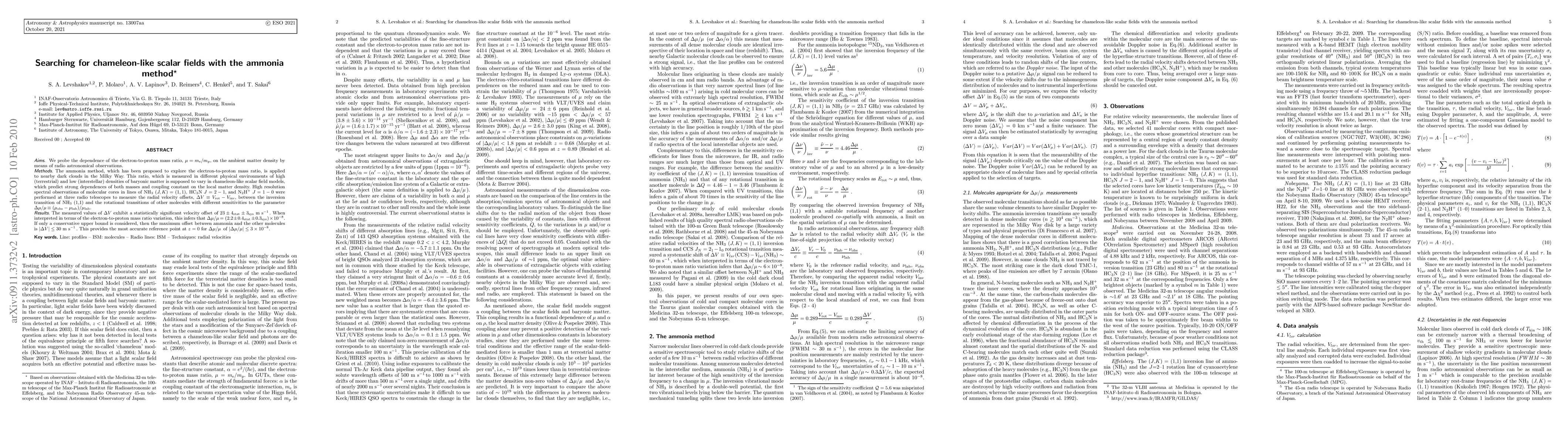 (Abridged) The ammonia method, which has been proposed to explore the electron-to-proton mass ratio, mu = m_e/m_p, is applied to nearby dark clouds in the Milky Way. This ratio, which is measured in different physical environments of high (terrestrial) and low (interstellar) densities of baryonic matter is supposed to vary in chameleon-like scalar field models, which predict strong dependence of both masses and coupling constant on the local matter density. High resolution spectral observations of molecular cores in lines of NH3 (J,K) = (1,1), HC3N J = 2-1, and N2H+ J = 1-0 were performed at three radio telescopes to measure the radial velocity offsets, DeltaV = V_rot - V_inv, between the inversion transition of NH3 (1,1) and the rotational transitions of other molecules with different sensitivities to the parameter dmm = (mu_obs - mu_lab)/mu_lab. The measured values of DeltaV exhibit a statistically significant velocity offset of 23 +/- 4_stat +/- 3_sys m/s. When interpreted in terms of the electron-to-proton mass ratio variation, this infers that dmm = (2.2 +/- 0.4_stat +/- 0.3_sys)x10^{-8}. If only a conservative upper bound is considered, then the maximum offset between ammonia and the other molecules is |DeltaV| <= 30 m/s. This gives the most accurate reference point at z = 0 for dmm: |dmm| <= 3x10^{-8}.
