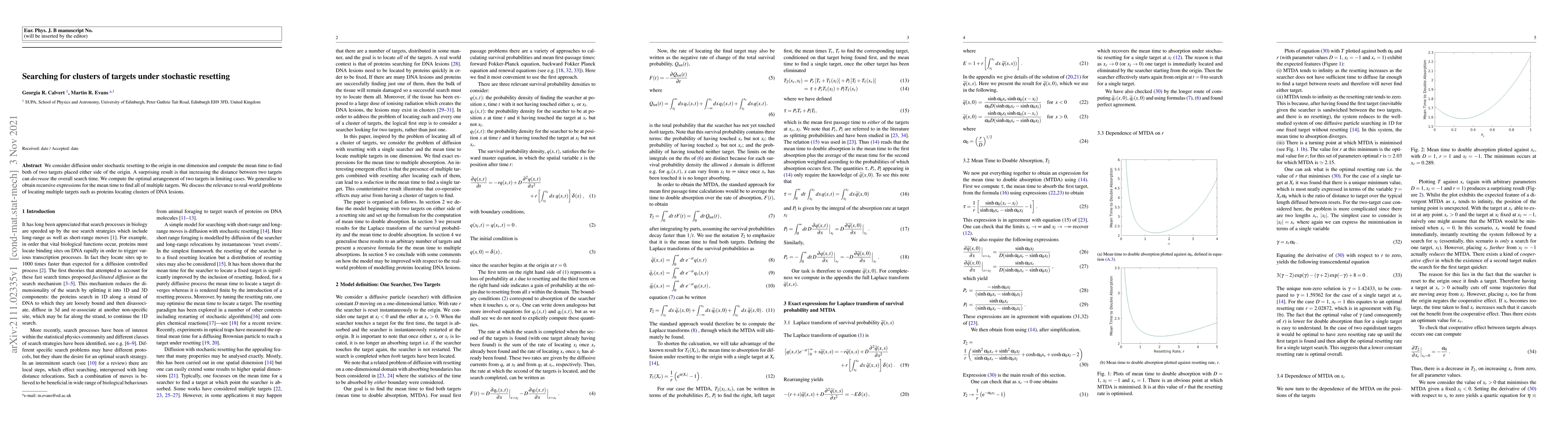 This paper investigates the mean time to locate two targets in a one-dimensional stochastic resetting diffusion process, revealing that increasing the distance between targets can paradoxically decrease search time. The study generalizes to multiple targets and discusses its relevance to biological systems like protein search for DNA lesions.