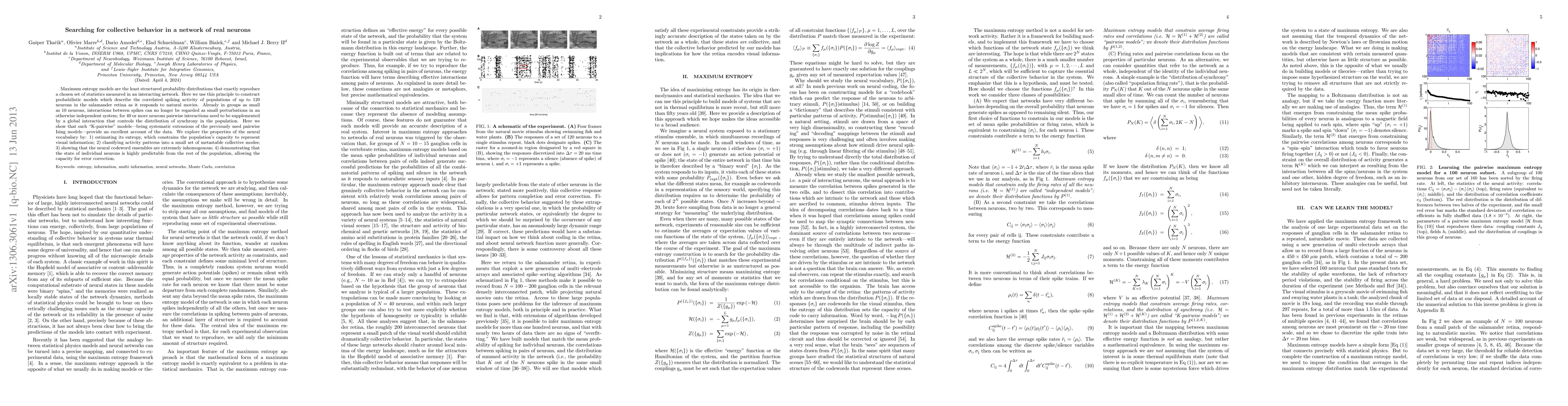 Maximum entropy models are the least structured probability distributions that exactly reproduce a chosen set of statistics measured in an interacting network. Here we use this principle to construct probabilistic models which describe the correlated spiking activity of populations of up to 120 neurons in the salamander retina as it responds to natural movies. Already in groups as small as 10 neurons, interactions between spikes can no longer be regarded as small perturbations in an otherwise independent system; for 40 or more neurons pairwise interactions need to be supplemented by a global interaction that controls the distribution of synchrony in the population. Here we show that such "K-pairwise" models--being systematic extensions of the previously used pairwise Ising models--provide an excellent account of the data. We explore the properties of the neural vocabulary by: 1) estimating its entropy, which constrains the population's capacity to represent visual information; 2) classifying activity patterns into a small set of metastable collective modes; 3) showing that the neural codeword ensembles are extremely inhomogenous; 4) demonstrating that the state of individual neurons is highly predictable from the rest of the population, allowing the capacity for error correction.