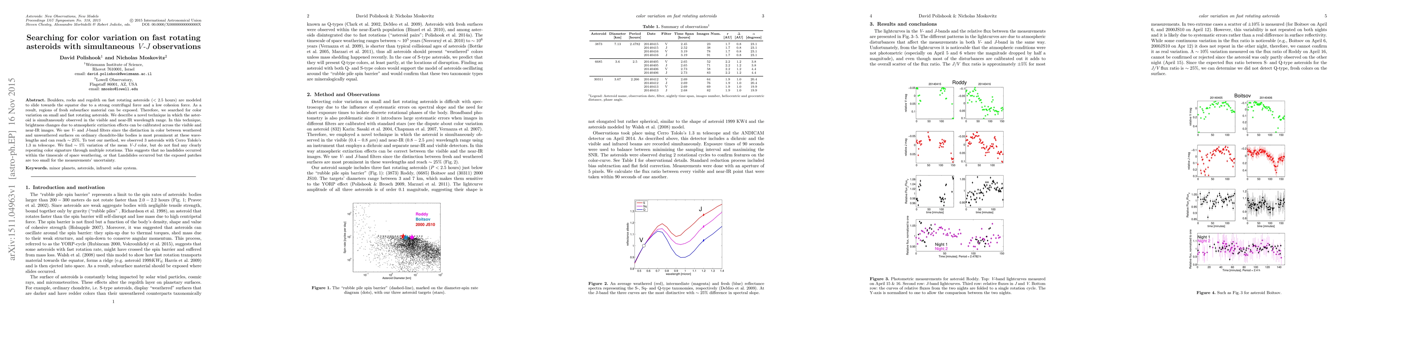 Researchers used a new technique to observe asteroids in visible and near-IR wavelengths, finding small color variations on fast-rotating asteroids suggesting no recent landslides or weathering events within the measurement uncertainty.