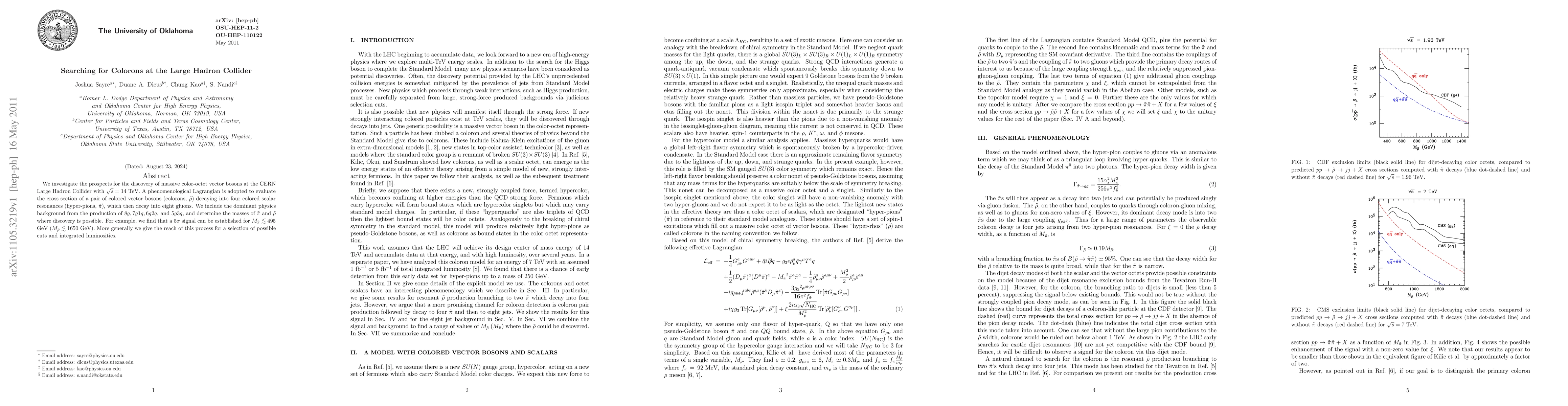 We investigate the prospects for the discovery of massive color-octet vector bosons at the CERN Large Hadron Collider with $\sqrt{s} = 14$ TeV. A phenomenological Lagrangian is adopted to evaluate the cross section of a pair of colored vector bosons (colorons, $\tilde{\rho}$) decaying into four colored scalar resonances (hyper-pions, $\tilde{\pi}$), which then decay into eight gluons. We include the dominant physics background from the production of $8g,7g1q, 6g2q$, and $5g3q$, and determine the masses of $\tilde{\pi}$ and $\tilde{\rho}$ where discovery is possible. For example, we find that a 5$\sigma$ signal can be established for $M_{\tilde{\pi}} \alt 495$ GeV ($M_{\tilde{\rho}} \alt 1650$ GeV). More generally we give the reach of this process for a selection of possible cuts and integrated luminosities.