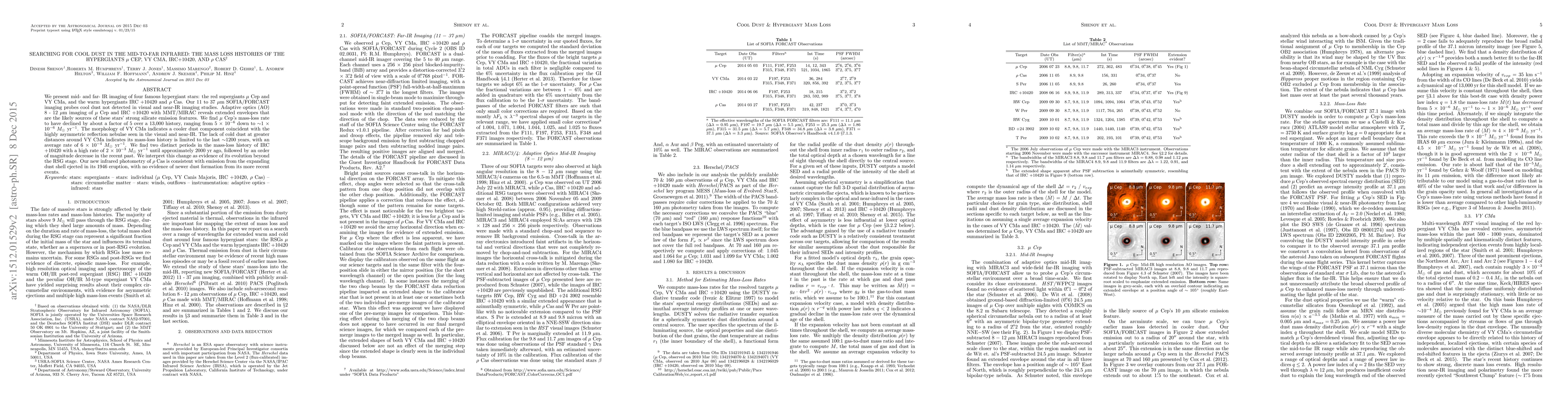 This study uses mid- and far-infrared imaging to investigate the mass-loss histories of four hypergiant stars, revealing cool dust and significant variations in their mass-loss rates over time. The findings suggest a decline in $\mu$ Cep's mass-loss rate, a recent mass-loss history for VY CMa, and a transition in IRC +10420's evolution, while $\rho$ Cas shows no new dust formation post-1946 eruption.