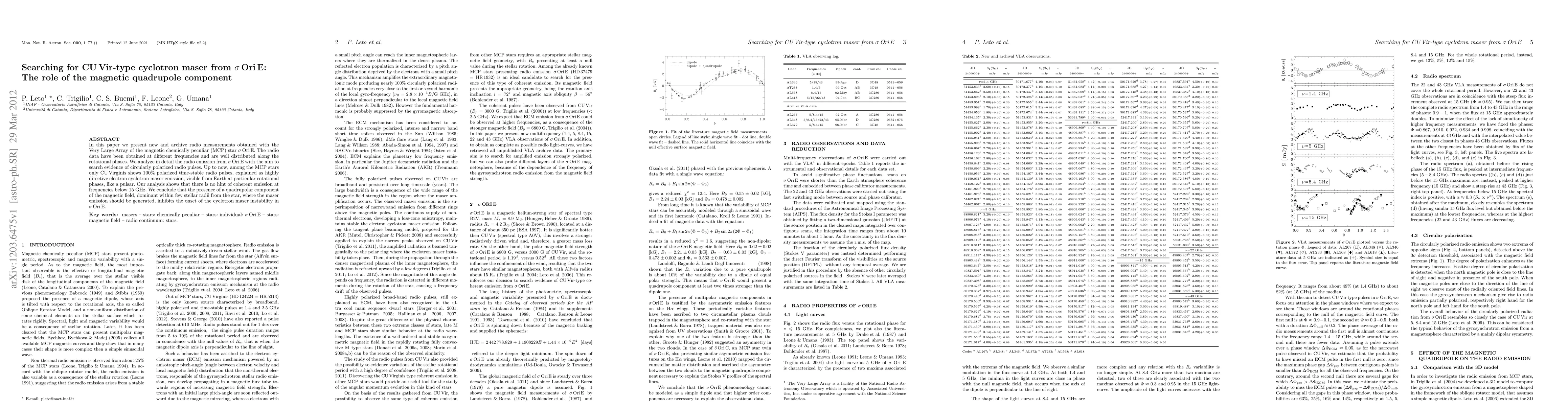 The study analyzed radio data from the MCP star σ Ori E, searching for 100% polarized, time-stable radio pulses similar to CU Vir. No such evidence was found below 15 GHz, suggesting that σ Ori E's quadrupolar magnetic field component, dominant near the star, prevents cyclotron maser instability.