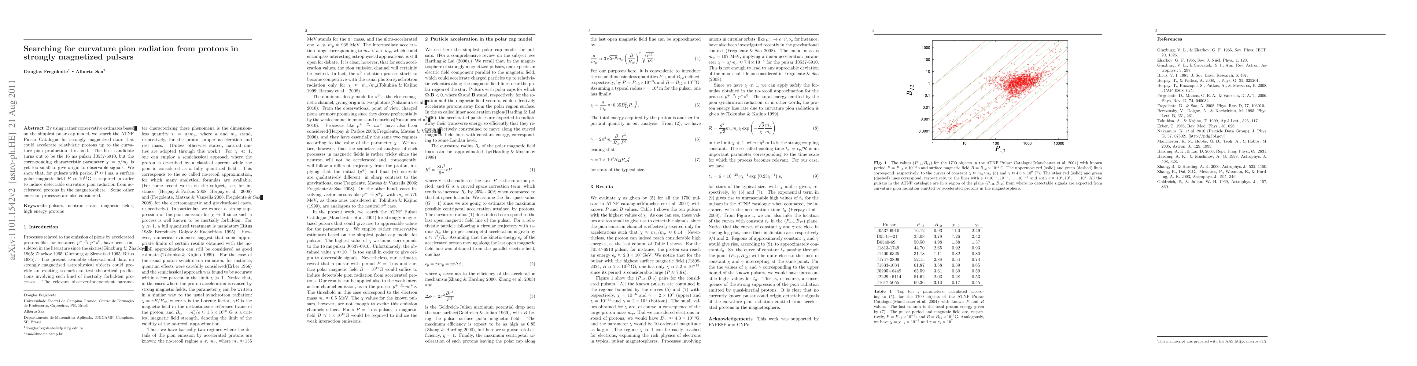 By using rather conservative estimates based on the simplest polar cap model, we search the ATNF Pulsar Catalogue for strongly magnetized stars that could accelerate relativistic protons up to the curvature pion production threshold. The best candidate turns out to be the 16 ms pulsar J0537-6910, but the corresponding characteristic parameter $\chi=a/m_p$ is yet too small to give origin to observable signals. We show that, for pulsars with period $P\approx 1\,$ms, a surface polar magnetic field $B \approx 10^{12}$G is required in order to induce detectable curvature pion radiation from accelerated protons in the magnetosphere. Some other emission processes are also considered.