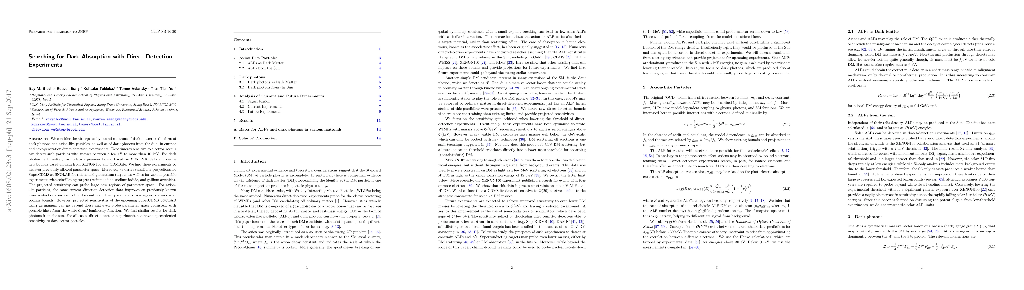 We consider the absorption by bound electrons of dark matter in the form of dark photons and axion-like particles, as well as of dark photons from the Sun, in current and next-generation direct detection experiments. Experiments sensitive to electron recoils can detect such particles with masses between a few eV to more than 10 keV. For dark photon dark matter, we update a previous bound based on XENON10 data and derive new bounds based on data from XENON100 and CDMSlite. We find these experiments to disfavor previously allowed parameter space. Moreover, we derive sensitivity projections for SuperCDMS at SNOLAB for silicon and germanium targets, as well as for various possible experiments with scintillating targets (cesium iodide, sodium iodide, and gallium arsenide). The projected sensitivity can probe large new regions of parameter space. For axion-like particles, the same current direction detection data improves on previously known direct-detection constraints but does not bound new parameter space beyond known stellar cooling bounds. However, projected sensitivities of the upcoming SuperCDMS SNOLAB using germanium can go beyond these and even probe parameter space consistent with possible hints from the white dwarf luminosity function. We find similar results for dark photons from the sun. For all cases, direct-detection experiments can have unprecedented sensitivity to dark-sector particles.