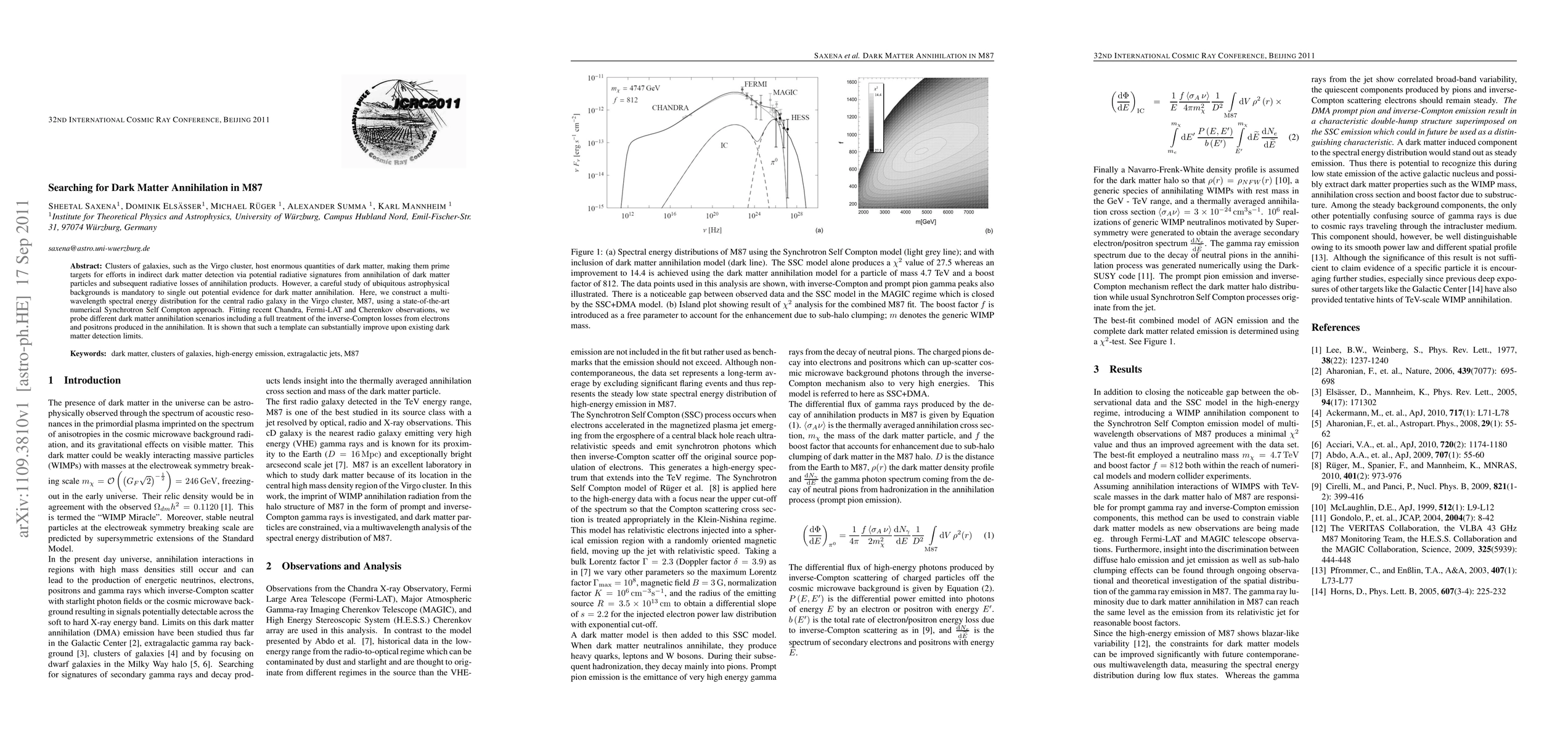Researchers created a detailed spectral energy distribution for M87, using data from Chandra, Fermi-LAT, and Cherenkov observations to test dark matter annihilation scenarios, showing improved detection limits.