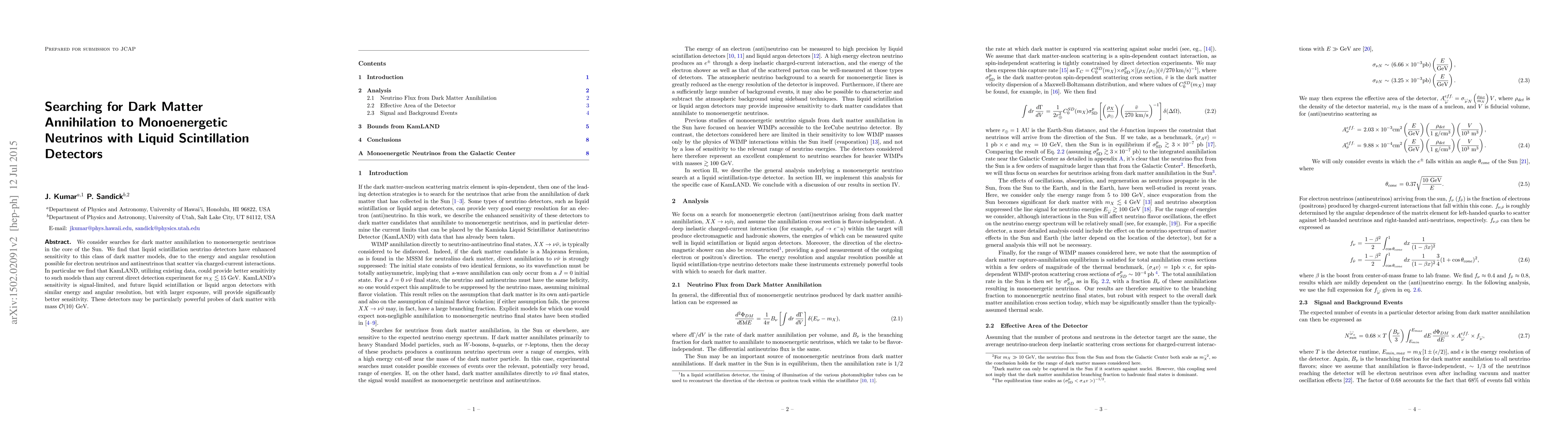 We consider searches for dark matter annihilation to monoenergetic neutrinos in the core of the Sun. We find that liquid scintillation neutrino detectors have enhanced sensitivity to this class of dark matter models, due to the energy and angular resolution possible for electron neutrinos and antineutrinos that scatter via charged-current interactions. In particular we find that KamLAND, utilizing existing data, could provide better sensitivity to such models than any current direct detection experiment for $m_X \lesssim 15$ GeV. KamLAND's sensitivity is signal-limited, and future liquid scintillation or liquid argon detectors with similar energy and angular resolution, but with larger exposure, will provide significantly better sensitivity. These detectors may be particularly powerful probes of dark matter with mass $\mathcal{O}(10)$ GeV.
