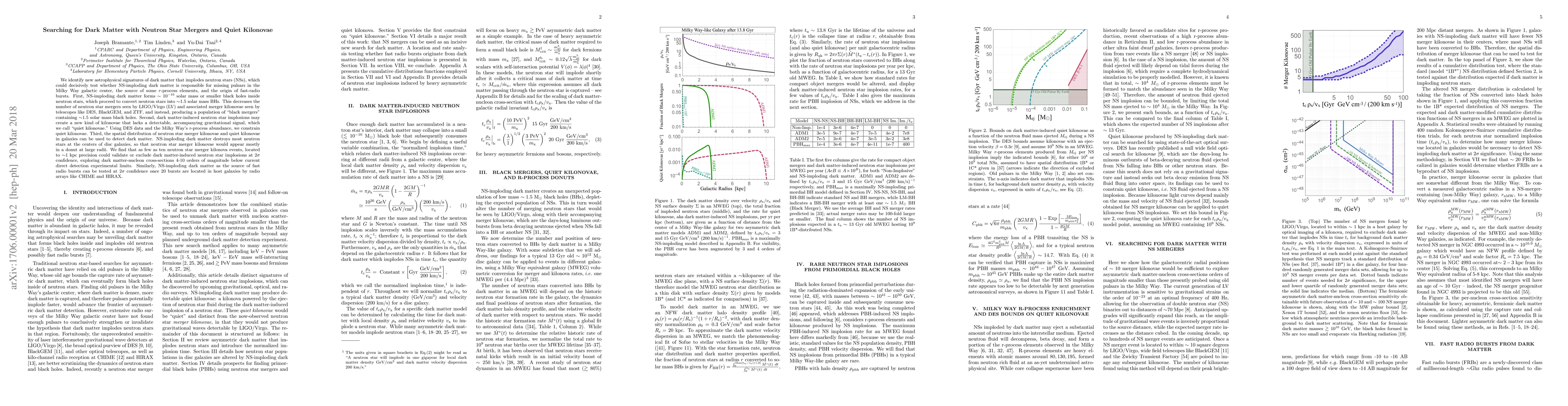 We identify new astrophysical signatures of dark matter that implodes neutron stars (NSs), which could decisively test whether NS-imploding dark matter is responsible for missing pulsars in the Milky Way galactic center, the source of some $r$-process elements, and the origin of fast-radio bursts. First, NS-imploding dark matter forms $\sim 10^{-10}$ solar mass or smaller black holes inside neutron stars, which proceed to convert neutron stars into $\sim$1.5 solar mass BHs. This decreases the number of neutron star mergers seen by LIGO/Virgo (LV) and associated merger kilonovae seen by telescopes like DES, BlackGEM, and ZTF, and instead, producing a population of "black mergers" containing $\sim$1.5 solar mass black holes. Second, dark matter-induced neutron star implosions may create a new kind of kilonovae that lacks a detectable, accompanying gravitational signal, which we call "quiet kilonovae." Using DES data and the Milky Way's r-process abundance, we constrain quiet kilonovae. Third, the spatial distribution of neutron star merger kilonovae and quiet kilonovae in galaxies can be used to detect dark matter. NS-imploding dark matter destroys most neutron stars at the centers of disc galaxies, so that neutron star merger kilonovae would appear mostly in a donut at large radii. We find that as few as ten neutron star merger kilonova events, located to $\sim$1 kpc precision could validate or exclude dark matter-induced neutron star implosions at $2 \sigma$ confidence, exploring dark matter-nucleon cross-sections 4-10 orders of magnitude below current direct detection experimental limits. Similarly, NS-imploding dark matter as the source of fast radio bursts can be tested at $2 \sigma$ confidence once 20 bursts are located in host galaxies by radio arrays like CHIME and HIRAX.