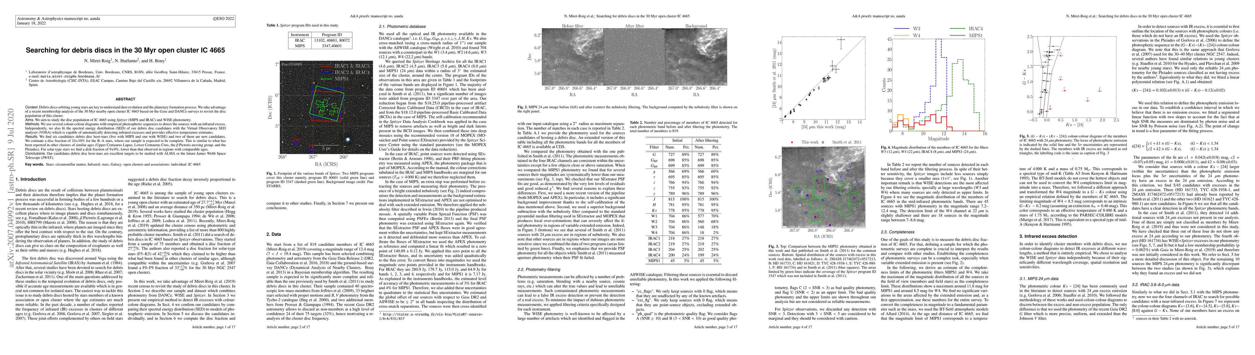 Context: Debris discs orbiting young stars are key to understand dust evolution and the planetary formation process. We take advantage of a recent membership analysis of the 30 Myr nearby open cluster IC 4665 based on the Gaia and DANCe surveys to revisit the disc population of this cluster. Aims: We aim to study the disc population of IC 4665 using Spitzer (MIPS and IRAC) and WISE photometry. Methods: We use several colour-colour diagrams with empirical photospheric sequences to detect the sources with an infrared excess. Independently, we also fit the spectral energy distribution (SED) of our debris disc candidates with the Virtual Observatory SED analyser (VOSA) which is capable of automatically detecting infrared excesses and provides effective temperature estimates. Results: We find six candidates debris disc host-stars (five with MIPS and one with WISE) and two of them are new candidates. We estimate a disc fraction of 24$\pm$10\% for the B-A stars, where our sample is expected to be complete. This is similar to what has been reported in other clusters of similar ages (Upper Centaurus Lupus, Lower Centaurus Crux, the $\beta$ Pictoris moving group, and the Pleiades). For solar type stars we find a disk fraction of 9$\pm$9%, lower than that observed in regions with comparable ages. Conclusions: Our candidates debris disc host-stars are excellent targets to be studied with ALMA or the future James Webb Space Telescope (JWST).