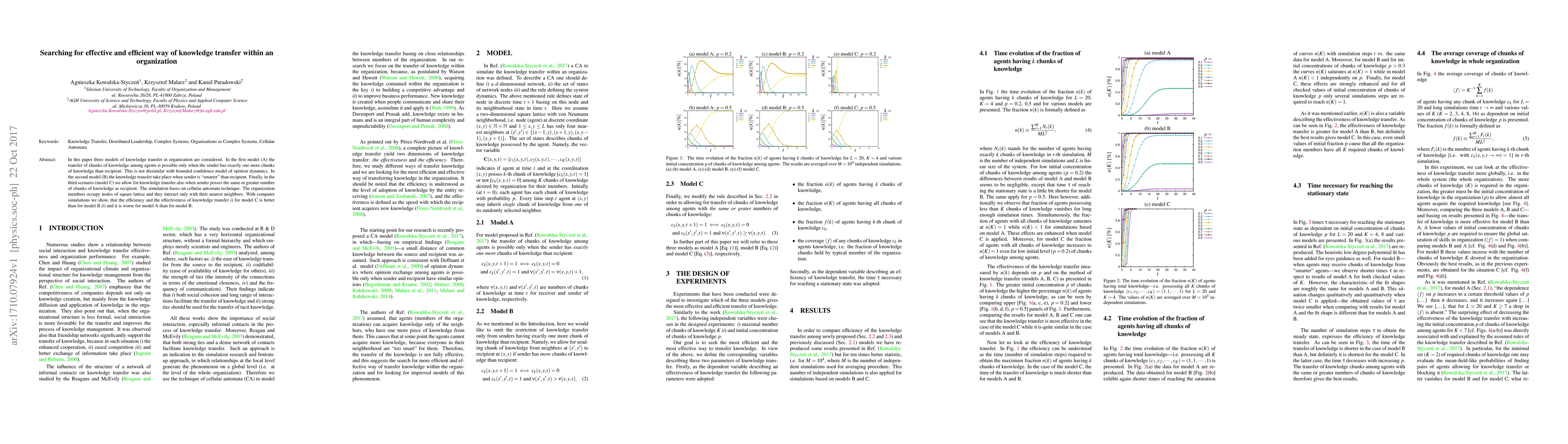Researchers compared three models of knowledge transfer in organizations and found that model C, allowing equal or more knowledge chunks between sender and recipient, was the most efficient and effective way to share knowledge.