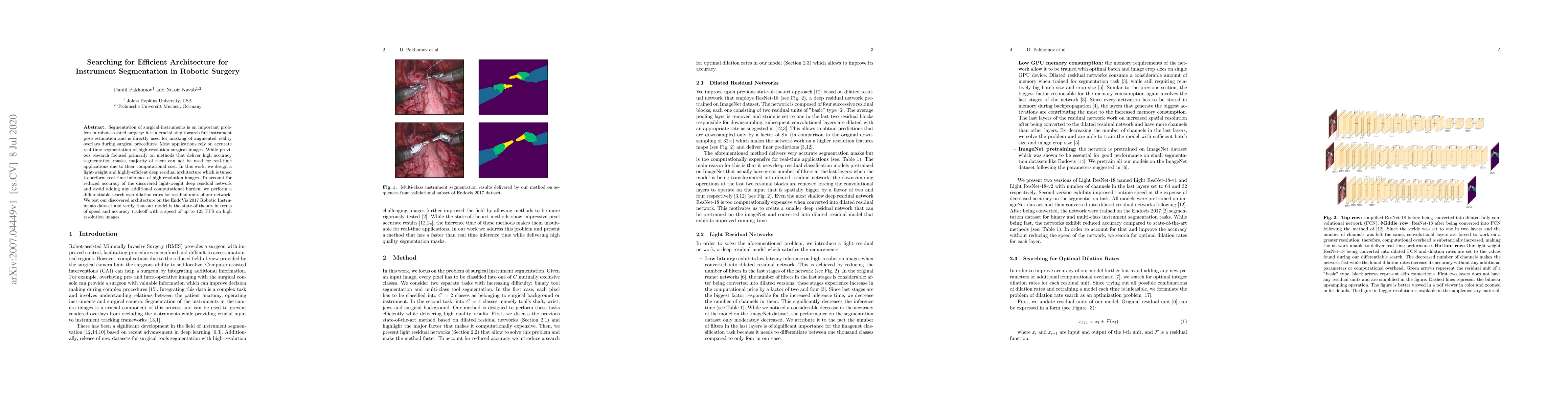 This paper proposes a lightweight and efficient deep residual architecture for real-time segmentation of surgical instruments in robotic surgery, achieving a balance between speed and accuracy. The model uses a differentiable search to optimize dilation rates, resulting in state-of-the-art performance with up to 125 FPS on high-resolution images.