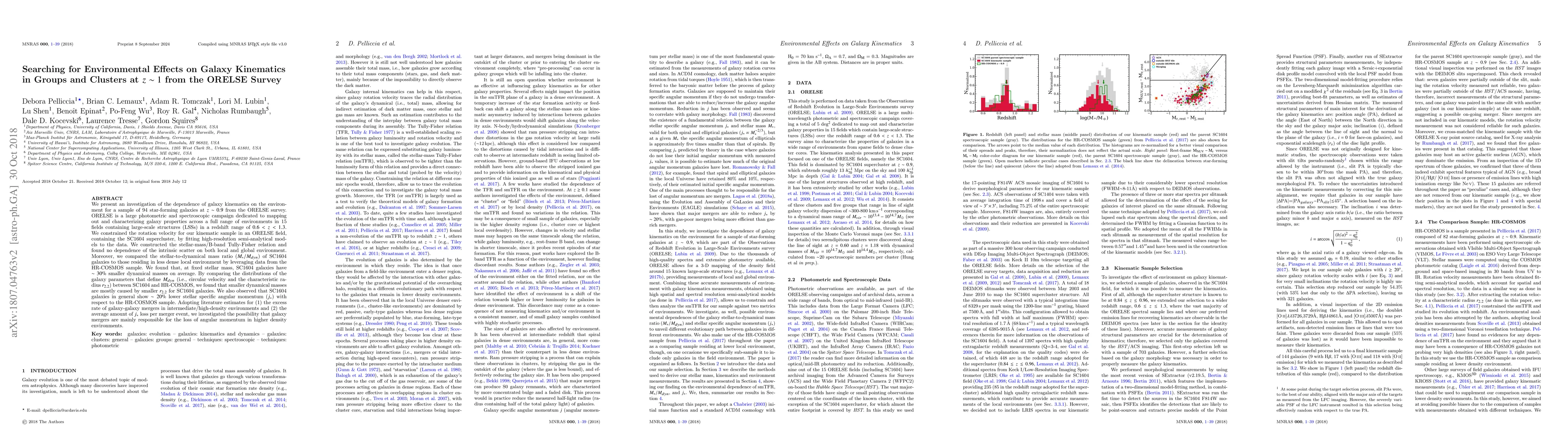 We present an investigation of the dependence of galaxy kinematics on the environment for a sample of 94 star-forming galaxies at $z\sim0.9$ from the ORELSE survey. ORELSE is a large photometric and spectroscopic campaign dedicated to mapping out and characterizing galaxy properties across a full range of environments in 15 fields containing large-scale structures (LSSs) in a redshift range of $0.6 < z < 1.3$. We constrained the rotation velocity for our kinematic sample in an ORELSE field, containing the SC1604 supercluster, by fitting high-resolution semi-analytical models to the data. We constructed the stellar-mass/B-band Tully-Fisher relation and found no dependence of the intrinsic scatter on both local and global environment. Moreover, we compared the stellar-to-dynamical mass ratio ($M_\ast/M_{dyn}$) of SC1604 galaxies to those residing in less dense local environment by leveraging data from the HR-COSMOS sample. We found that, at fixed stellar mass, SC1604 galaxies have $\sim30\%$ smaller dynamical masses on average. By comparing the distributions of the galaxy parameters that define $M_{dyn}$ (i.e., circular velocity and the characteristic radius $r_{2.2}$) between SC1604 and HR-COSMOS, we found that smaller dynamical masses are mostly caused by smaller $r_{2.2}$ for SC1604 galaxies. We also observed that SC1604 galaxies in general show $\sim20\%$ lower stellar specific angular momentum ($j_\ast$) with respect to the HR-COSMOS sample. Adopting literature estimates for (1) the excess rate of galaxy-galaxy mergers in intermediate/high-density environments and (2) the average amount of $j_\ast$ loss per merger event, we investigated the possibility that galaxy mergers are mainly responsible for the loss of angular momentum in higher density environments.