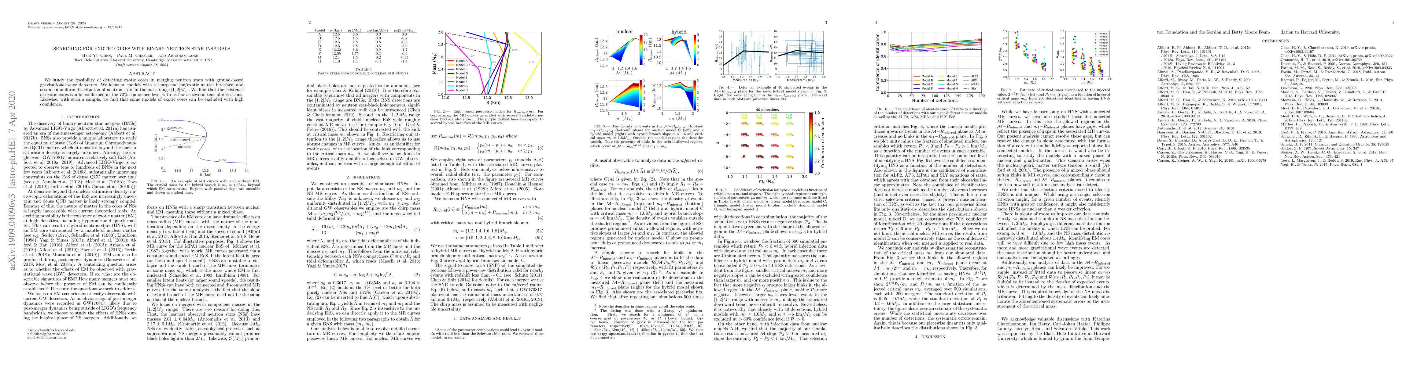 This paper investigates the potential of gravitational-wave detectors to identify exotic cores in merging neutron stars, particularly those with a distinct nuclear/exotic matter boundary. The study suggests that with a sample of several tens of detections, the existence of exotic cores can be confirmed at a 70% confidence level, and certain models can be excluded with high confidence.