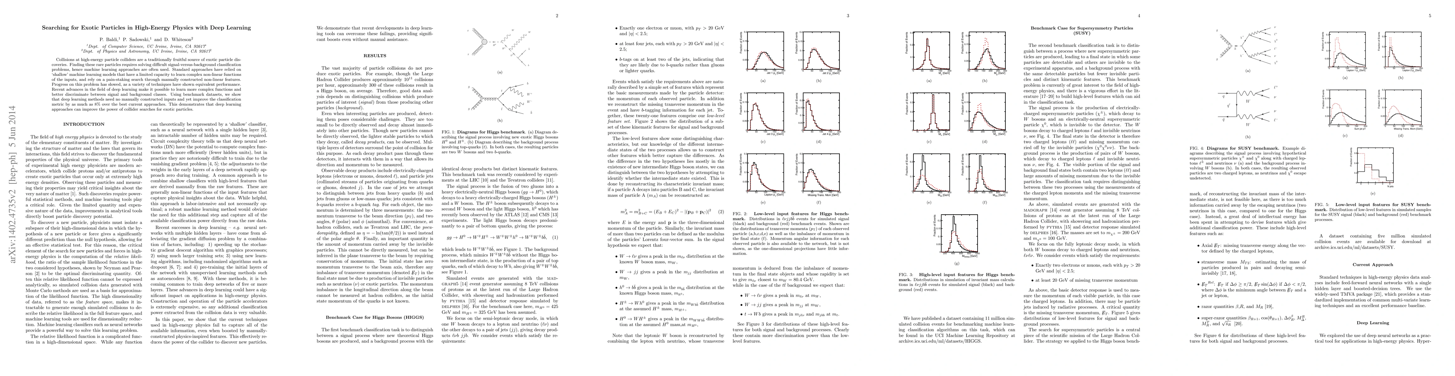 Deep learning approaches improve signal-versus-background classification in high-energy particle collisions by up to 8%, making them a powerful tool for discovering exotic particles without manually constructed features.