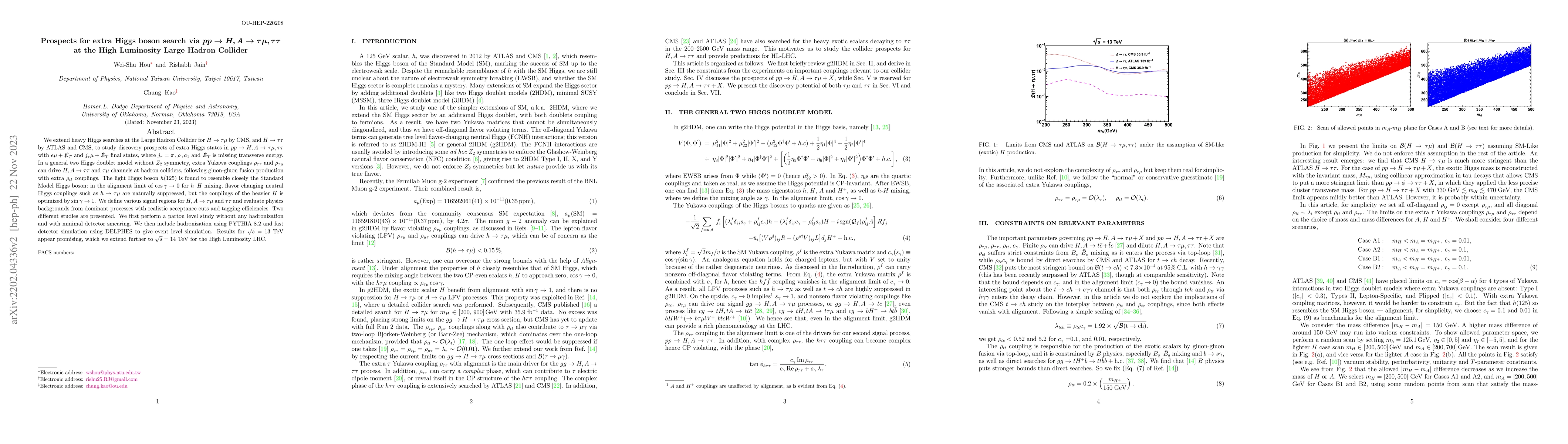 We extend heavy Higgs searches at the Large Hadron Collider for $H \to \tau \mu$ by CMS, and $H \to \tau\tau$ by ATLAS and CMS, to study discovery prospects of extra Higgs states in $pp \to H,A \to \tau \mu, \tau\tau$ with $e\mu + E_T$ and $j_{\tau} \mu + E_T$ final states, where $j_{\tau} = \pi \, , \rho\, , a_1$ and $E_T$ is missing transverse energy. In a general two Higgs doublet model without $Z_2$ symmetry, extra Yukawa couplings $\rho_{\tau\tau}$ and $\rho_{\tau\mu}$ can drive $H,A \to \tau\tau$ and $\tau\mu$ channels at hadron colliders, following gluon-gluon fusion production with extra $\rho_{tt}$ couplings. The light Higgs boson $h(125)$ is found to resemble closely the Standard Model Higgs boson; in the alignment limit of $\cos\gamma \to 0$ for $h$--$H$ mixing, flavor changing neutral Higgs couplings such as $h \to \tau\mu$ are naturally suppressed, but the couplings of the heavier $H$ is optimized by $\sin \gamma \to 1$. We define various signal regions for $H,A \to \tau\mu$ and $\tau \tau$ and evaluate physics backgrounds from dominant processes with realistic acceptance cuts and tagging efficiencies. Two different studies are presented. We first perform a parton level study without any hadronization and with minimal detector smearing. We then include hadronization using PYTHIA 8.2 and fast detector simulation using DELPHES to give event level simulation. Results for $\sqrt{s}= 13$ TeV appear promising, which we extend further to $\sqrt{s} = 14$ TeV for the High Luminosity LHC.