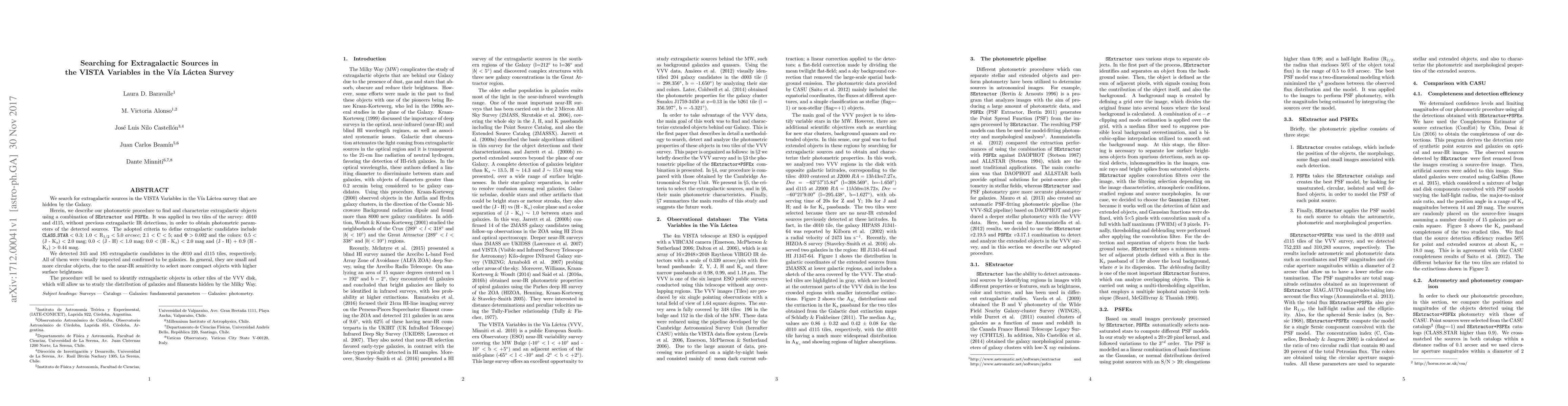 This paper presents a method for identifying extragalactic sources in the VISTA Variables in the V\'ia L\'actea survey, using photometric criteria and tools like SExtractor and PSFEx. The study detected 345 and 185 extragalactic candidates in two survey tiles, confirming them as galaxies through visual inspection.