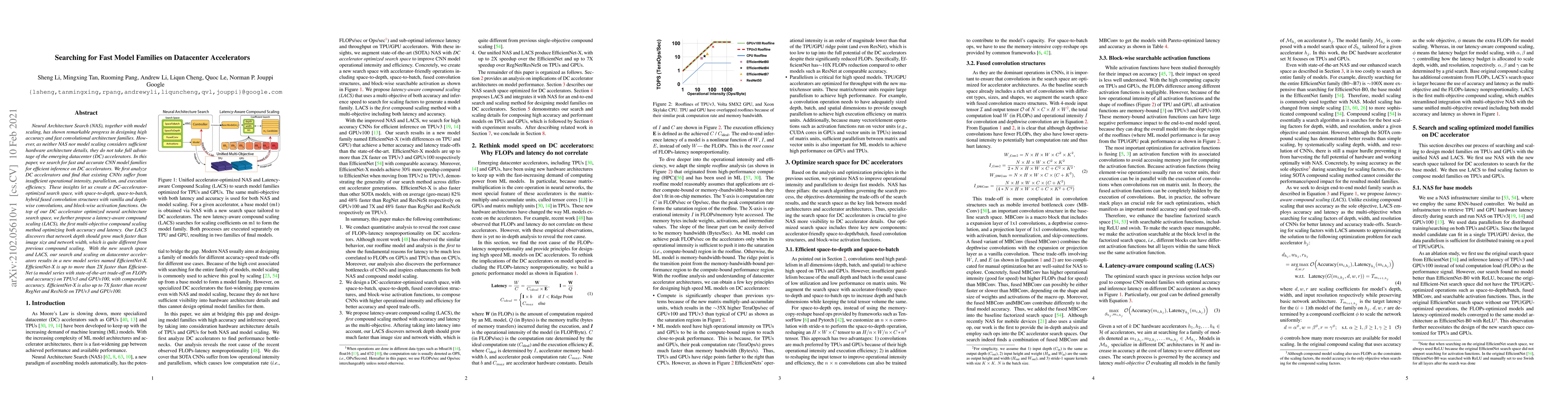 This paper proposes a new search space and scaling method, latency-aware compound scaling (LACS), to design fast and accurate CNN model families for efficient inference on datacenter accelerators. The new model series, EfficientNet-X, achieves up to 2X faster performance than EfficientNet on TPUv3 and GPUv100 while maintaining comparable accuracy.