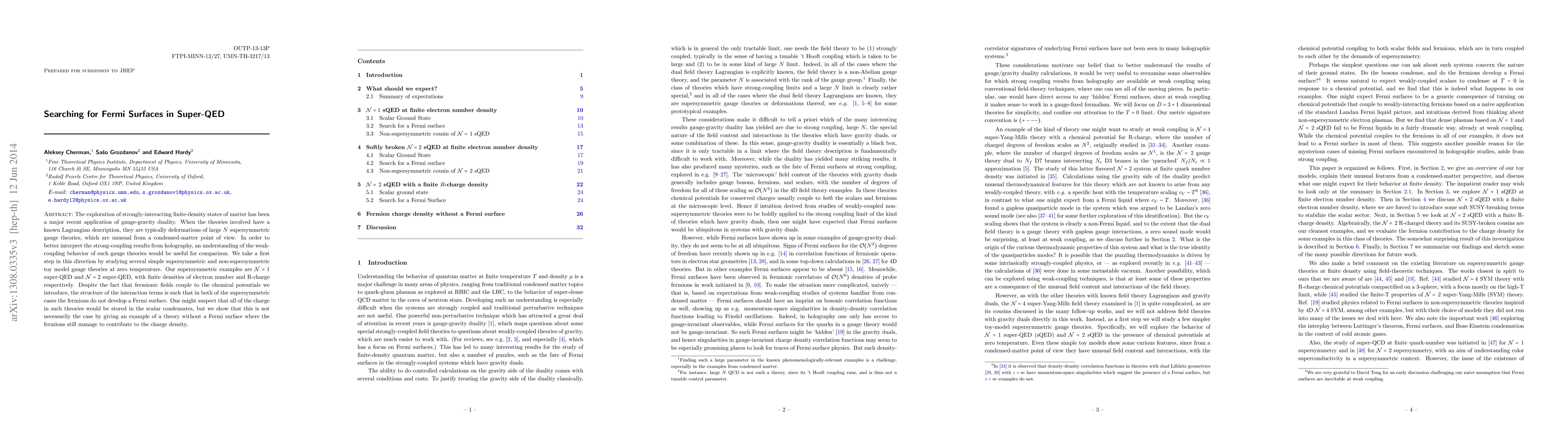 The exploration of strongly-interacting finite-density states of matter has been a major recent application of gauge-gravity duality. When the theories involved have a known Lagrangian description, they are typically deformations of large $N$ supersymmetric gauge theories, which are unusual from a condensed-matter point of view. In order to better interpret the strong-coupling results from holography, an understanding of the weak-coupling behavior of such gauge theories would be useful for comparison. We take a first step in this direction by studying several simple supersymmetric and non-supersymmetric toy model gauge theories at zero temperature. Our supersymmetric examples are $\mathcal{N}=1$ super-QED and $\mathcal{N}=2$ super-QED, with finite densities of electron number and R-charge respectively. Despite the fact that fermionic fields couple to the chemical potentials we introduce, the structure of the interaction terms is such that in both of the supersymmetric cases the fermions do not develop a Fermi surface. One might suspect that all of the charge in such theories would be stored in the scalar condensates, but we show that this is not necessarily the case by giving an example of a theory without a Fermi surface where the fermions still manage to contribute to the charge density.