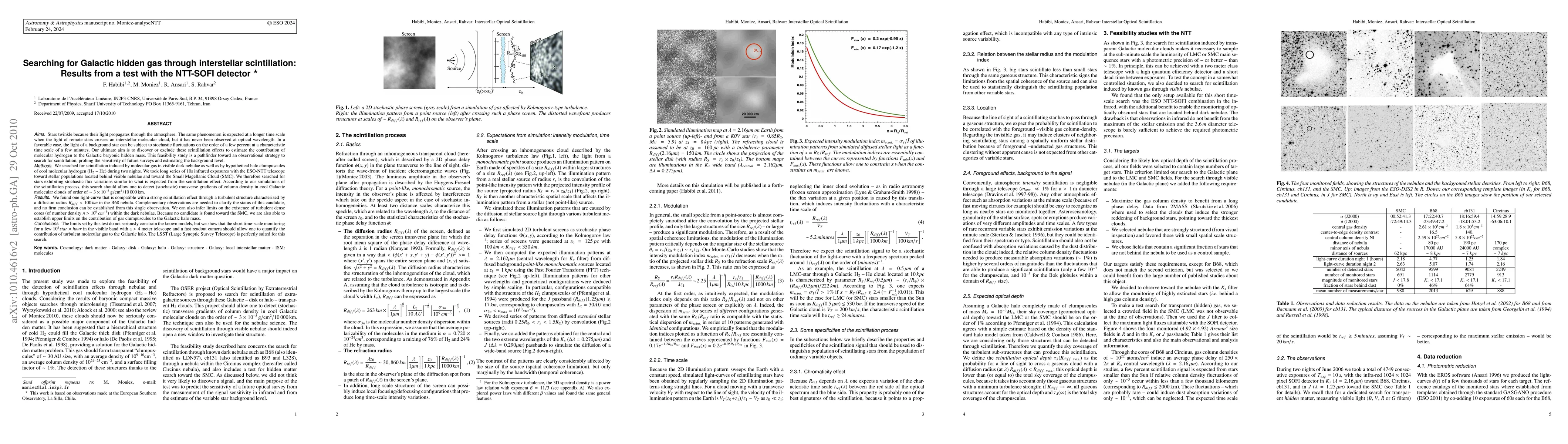 Aims: Stars twinkle because their light propagates through the atmosphere. The same phenomenon is expected at a longer time scale when the light of remote stars crosses an interstellar molecular cloud, but it has never been observed at optical wavelength. In a favorable case, the light of a background star can be subject to stochastic fluctuations on the order of a few percent at a characteristic time scale of a few minutes. Our ultimate aim is to discover or exclude these scintillation effects to estimate the contribution of molecular hydrogen to the Galactic baryonic hidden mass. This feasibility study is a pathfinder toward an observational strategy to search for scintillation, probing the sensitivity of future surveys and estimating the background level. Methods: We searched for scintillation induced by molecular gas in visible dark nebulae as well as by hypothetical halo clumpuscules of cool molecular hydrogen ($\mathrm{H_2-He}$) during two nights. We took long series of 10s infrared exposures with the ESO-NTT telescope toward stellar populations located behind visible nebulae and toward the Small Magellanic Cloud (SMC). We therefore searched for stars exhibiting stochastic flux variations similar to what is expected from the scintillation effect. According to our simulations of the scintillation process, this search should allow one to detect (stochastic) transverse gradients of column density in cool Galactic molecular clouds of order of $\sim 3\times 10^{-5}\,\mathrm{g/cm^2/10\,000\,km}$. Results: We found one light-curve that is compatible with a strong scintillation effect through a turbulent structure characterized by a diffusion radius $R_{diff}<100\, km$ in the B68 nebula. Complementary observations are needed to clarify the status of this candidate, and no firm conclusion can be established from this single observation. We can also infer limits on the existence of turbulent dense cores (of number density $n>10^9\, cm^{-3}$) within the dark nebulae. Because no candidate is found toward the SMC, we are also able to establish upper limits on the contribution of gas clumpuscules to the Galactic halo mass. Conclusions: The limits set by this test do not seriously constrain the known models, but we show that the short time-scale monitoring for a few $10^6 star\times hour$ in the visible band with a $>4$ meter telescope and a fast readout camera should allow one to quantify the contribution of turbulent molecular gas to the Galactic halo. The LSST (Large Synoptic Survey Telescope) is perfectly suited for this search.
