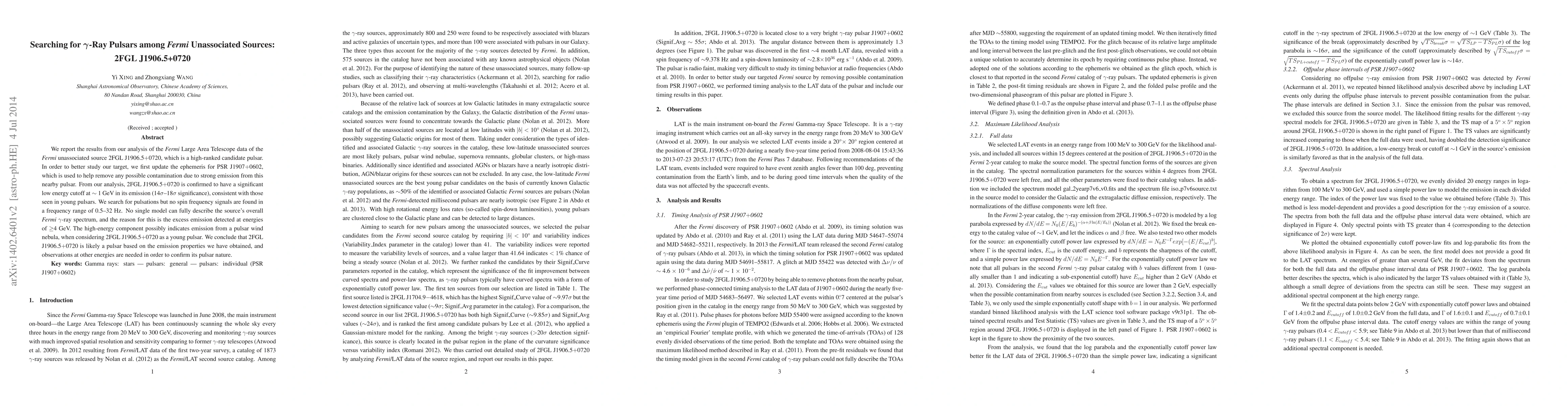 We report the results from our analysis of the \textit{Fermi} Large Area Telescope data of the \textit{Fermi} unassociated source 2FGL J1906.5$+$0720, which is a high-ranked candidate pulsar. In order to better study our target, we first update the ephemeris for PSR J1907$+$0602, which is used to help remove any possible contamination due to strong emission from this nearby pulsar. From our analysis, 2FGL J1906.5$+$0720 is confirmed to have a significant low energy cutoff at $\sim$ 1~GeV in its emission (14$\sigma$--18$\sigma$ significance), consistent with those seen in young pulsars. We search for pulsations but no spin frequency signals are found in a frequency range of 0.5--32 Hz. No single model can fully describe the source's overall \fermi\ $\gamma$-ray spectrum, and the reason for this is the excess emission detected at energies of $\geq$4 GeV. The high-energy component possibly indicates emission from a pulsar wind nebula, when considering 2FGL J1906.5$+$0720 as a young pulsar. We conclude that 2FGL J1906.5$+$0720 is likely a pulsar based on the emission properties we have obtained, and observations at other energies are needed in order to confirm its pulsar nature.