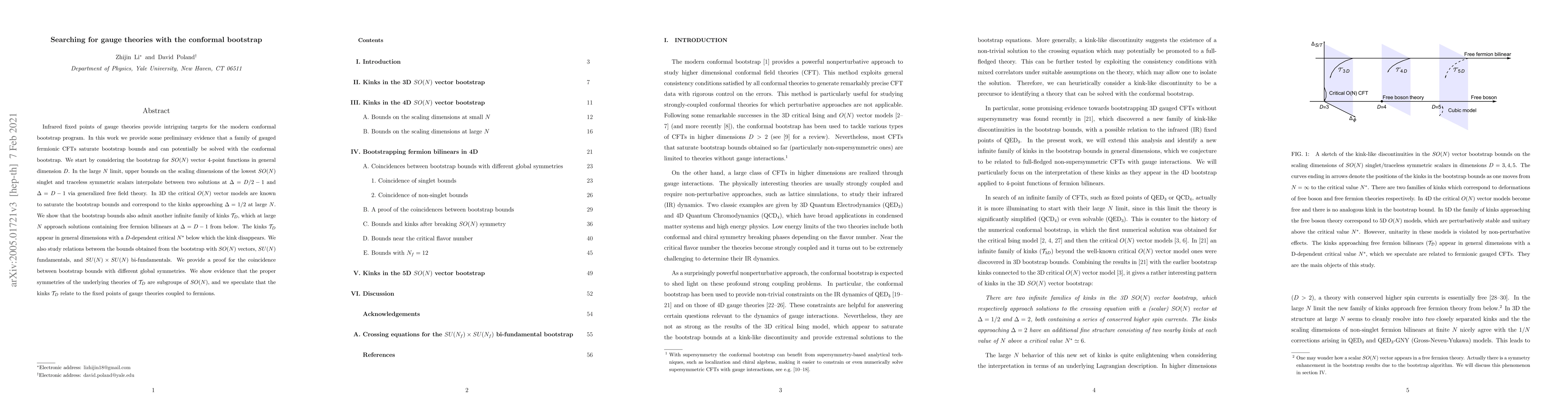 Infrared fixed points of gauge theories provide intriguing targets for the modern conformal bootstrap program. In this work we provide some preliminary evidence that a family of gauged fermionic CFTs saturate bootstrap bounds and can potentially be solved with the conformal bootstrap. We start by considering the bootstrap for $SO(N)$ vector 4-point functions in general dimension $D$. In the large $N$ limit, upper bounds on the scaling dimensions of the lowest $SO(N)$ singlet and traceless symmetric scalars interpolate between two solutions at $\Delta =D/2-1$ and $\Delta =D-1$ via generalized free field theory. In 3D the critical $O(N)$ vector models are known to saturate the bootstrap bounds and correspond to the kinks approaching $\Delta =1/2$ at large $N$. We show that the bootstrap bounds also admit another infinite family of kinks ${\cal T}_D$, which at large $N$ approach solutions containing free fermion bilinears at $\Delta=D-1$ from below. The kinks ${\cal T}_D$ appear in general dimensions with a $D$-dependent critical $N^*$ below which the kink disappears. We also study relations between the bounds obtained from the bootstrap with $SO(N)$ vectors, $SU(N)$ fundamentals, and $SU(N)\times SU(N)$ bi-fundamentals. We provide a proof for the coincidence between bootstrap bounds with different global symmetries. We show evidence that the proper symmetries of the underlying theories of ${\cal T}_D$ are subgroups of $SO(N)$, and we speculate that the kinks ${\cal T}_D$ relate to the fixed points of gauge theories coupled to fermions.