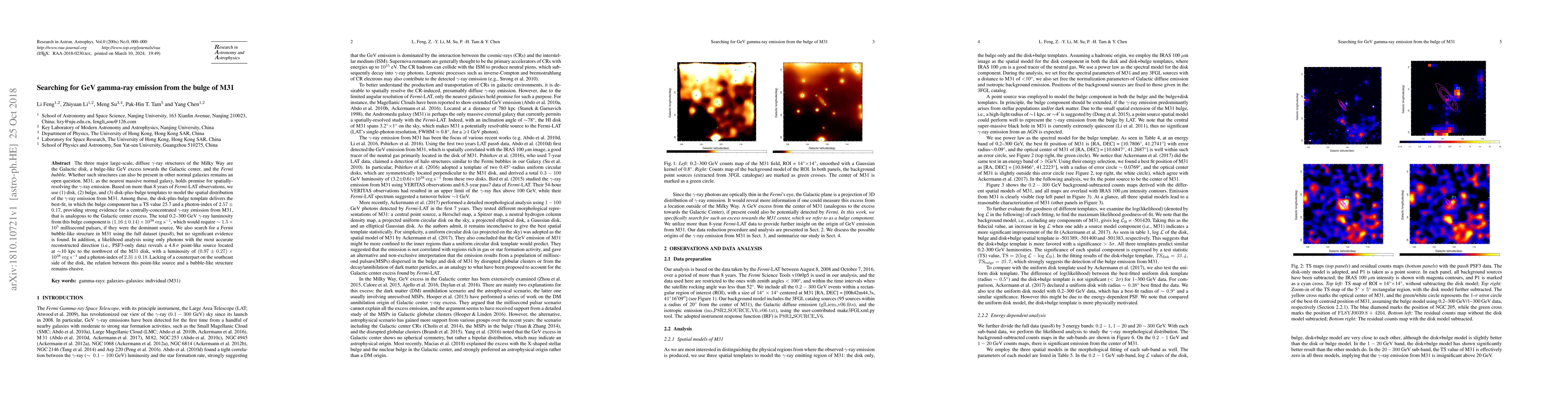 The three major large-scale, diffuse $\gamma$-ray structures of the Milky Way are the Galactic disk, a bulge-like GeV excess towards the Galactic center, and the Fermi bubble. Whether such structures can also be present in other normal galaxies remains an open question. M31, as the nearest massive normal galaxy, holds promise for spatially-resolving the $\gamma$-ray emission. Based on more than 8 years of Fermi-LAT observations, we use (1) disk, (2) bulge, and (3) disk-plus-bulge templates to model the spatial distribution of the $\gamma$-ray emission from M31. Among these, the disk-plus-bulge template delivers the best-fit, in which the bulge component has a TS value 25.7 and a photon-index of $2.57\pm0.17$, providing strong evidence for a centrally-concentrated gamma-ray emission from M31, that is analogous to the Galactic center excess. The total 0.2-300 GeV gamma-ray luminosity from this bulge component is $(1.16\pm0.14)\times10^{38} erg s^{-1}$, which would require $\sim1.5\times10^5$ millisecond pulsars, if they were the dominant source. We also search for a Fermi bubble-like structure in M31 using the full dataset (pass8), but no significant evidence is found. In addition, a likelihood analysis using only photons with the most accurate reconstructed direction (i.e., PSF3-only data) reveals a 4.8 $\sigma$ point-like source located at $\sim$ 10kpc to the northwest of the M31 disk, with a luminosity of $(0.97\pm0.27)\times10^{38} erg s^{-1}$ and a photon-index of $2.31\pm0.18$. Lacking of a counterpart on the southeast side of the disk, the relation between this point-like source and a bubble-like structure remains elusive.