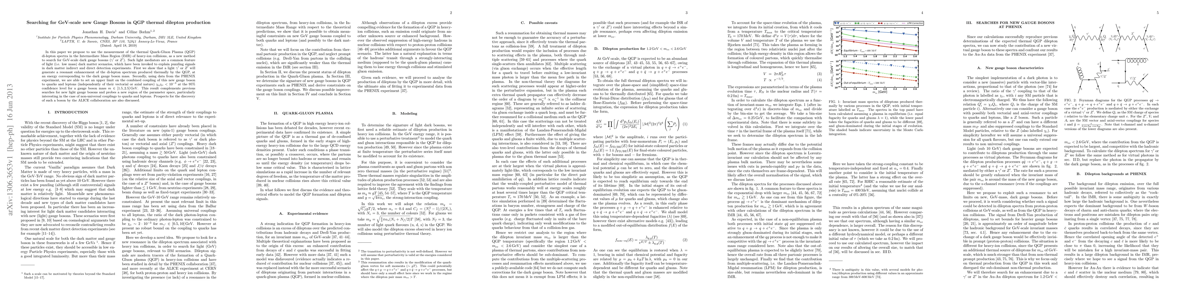 In this paper we propose to use the measurement of the thermal Quark-Gluon Plasma (QGP) dilepton spectra in the Intermediate Mass Region (IMR) of heavy-ion collisions, as a new method to search for GeV-scale dark gauge bosons (gamma' or Z'). Such light mediators are a common feature of light (i.e. low mass) dark matter scenarios, which have been invoked to explain puzzling signals in dark matter indirect and direct detection experiments. First we show that a light gamma' or Z' will generate a resonant enhancement of the dilepton spectrum produced thermally by the QGP, at an energy corresponding to the dark gauge boson mass. Secondly, using data from the PHENIX experiment, we are able to set an upper limit on the combined coupling of this new gauge boson to quarks and leptons (independently of their vectorial or axial nature) chi_q chi_e < 10^(-3) at the 95% confidence level for a gauge boson mass in the range 1.5 - 2.5 GeV. This result complements previous searches for new light gauge bosons and probes a new region of the parameter space, particularly interesting in the case of non-universal couplings to quarks and leptons. Prospects for the discovery of such a boson by the ALICE collaboration are also discussed.