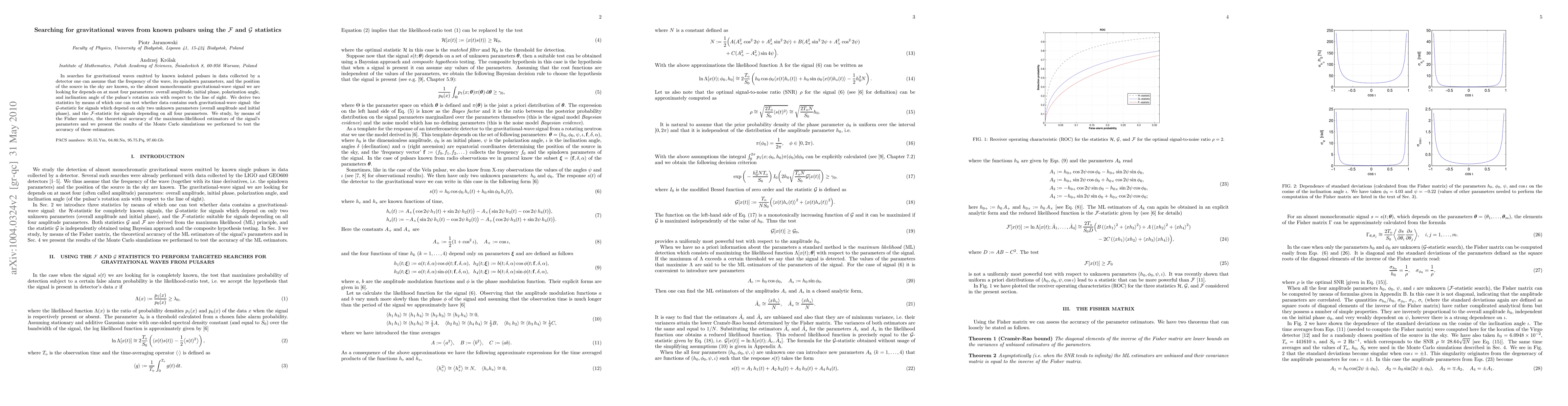 In searches for gravitational waves emitted by known isolated pulsars in data collected by a detector one can assume that the frequency of the wave, its spindown parameters, and the position of the source in the sky are known, so the almost monochromatic gravitational-wave signal we are looking for depends on at most four parameters: overall amplitude, initial phase, polarization angle, and inclination angle of the pulsar's rotation axis with respect to the line of sight. We derive two statistics by means of which one can test whether data contains such gravitational-wave signal: the $\mathcal{G}$-statistic for signals which depend on only two unknown parameters (overall amplitude and initial phase), and the $\mathcal{F}$-statistic for signals depending on all four parameters. We study, by means of the Fisher matrix, the theoretical accuracy of the maximum-likelihood estimators of the signal's parameters and we present the results of the Monte Carlo simulations we performed to test the accuracy of these estimators.