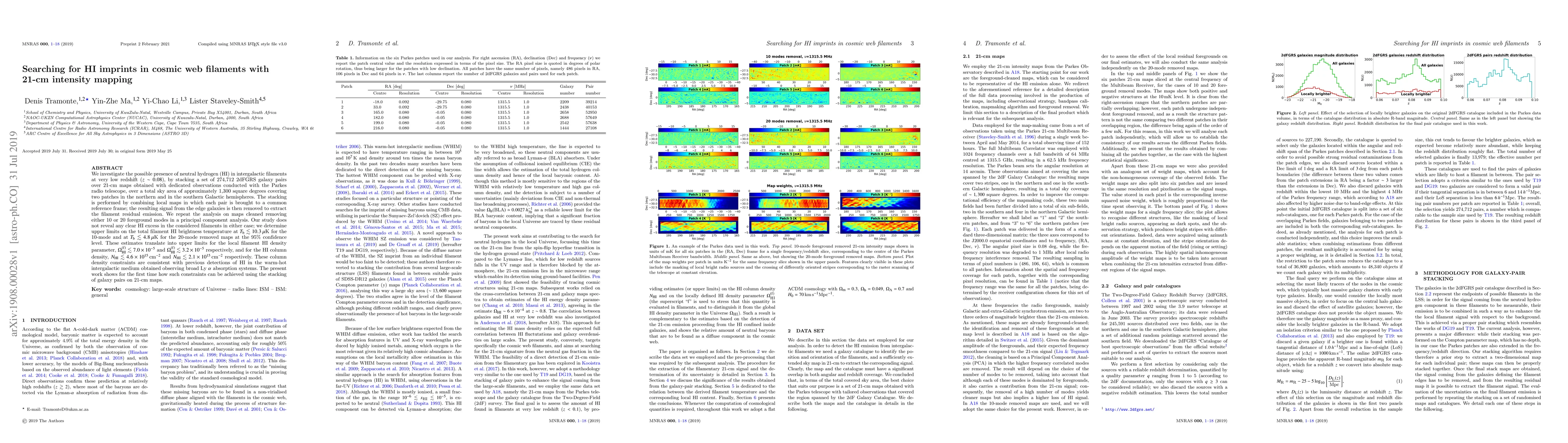 This study investigates neutral hydrogen (HI) in intergalactic filaments at low redshift using 21-cm intensity mapping and galaxy pair stacking, finding no clear HI excess. Upper limits on HI brightness temperature and column density are established, consistent with previous observations of the warm-hot intergalactic medium.