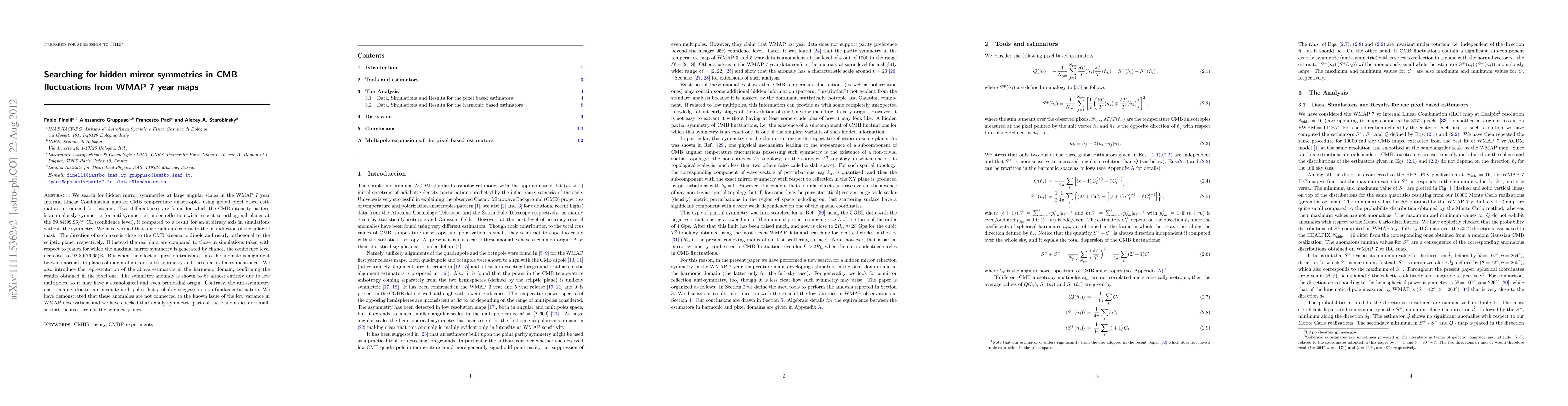 We search for hidden mirror symmetries at large angular scales in the WMAP 7 year Internal Linear Combination map of CMB temperature anisotropies using global pixel based estimators introduced for this aim. Two different axes are found for which the CMB intensity pattern is anomalously symmetric (or anti-symmetric) under reflection with respect to orthogonal planes at the 99.84(99.96)% CL (confidence level), if compared to a result for an arbitrary axis in simulations without the symmetry. We have verified that our results are robust to the introduction of the galactic mask. The direction of such axes is close to the CMB kinematic dipole and nearly orthogonal to the ecliptic plane, respectively. If instead the real data are compared to those in simulations taken with respect to planes for which the maximal mirror symmetry is generated by chance, the confidence level decreases to 92.39 (76.65)%. But when the effect in question translates into the anomalous alignment between normals to planes of maximal mirror (anti)-symmetry and these natural axes mentioned. We also introduce the representation of the above estimators in the harmonic domain, confirming the results obtained in the pixel one. The symmetry anomaly is shown to be almost entirely due to low multipoles, so it may have a cosmological and even primordial origin. Contrary, the anti-symmetry one is mainly due to intermediate multipoles that probably suggests its non-fundamental nature. We have demonstrated that these anomalies are not connected to the known issue of the low variance in WMAP observations and we have checked that axially symmetric parts of these anomalies are small, so that the axes are not the symmetry ones.
