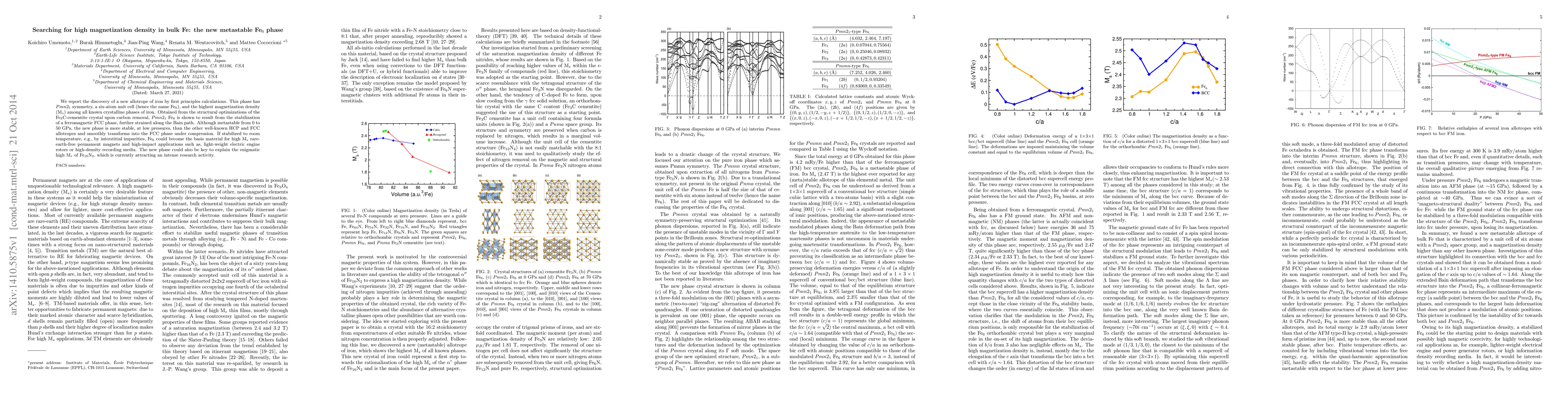 We report the discovery of a new allotrope of iron by first principles calculations. This phase has $Pmn2_1$ symmetry, a six-atom unit cell (hence the name Fe$_6$), and the highest magnetization density (M$_s$) among all known crystalline phases of iron. Obtained from the structural optimizations of the Fe$_3$C-cementite crystal upon carbon removal, $Pmn2_1$ Fe$_6$ is shown to result from the stabilization of a ferromagnetic FCC phase, further strained along the Bain path. Although metastable from 0 to 50 GPa, the new phase is more stable, at low pressures, than the other well-known HCP and FCC allotropes and smoothly transforms into the FCC phase under compression. If stabilized to room temperature, e.g., by interstitial impurities, Fe$_{6}$ could become the basis material for high M$_s$ rare-earth-free permanent magnets and high-impact applications such as, light-weight electric engine rotors or high-density recording media. The new phase could also be key to explain the enigmatic high M$_s$ of Fe$_{16}$N$_2$, which is currently attracting an intense research activity.
