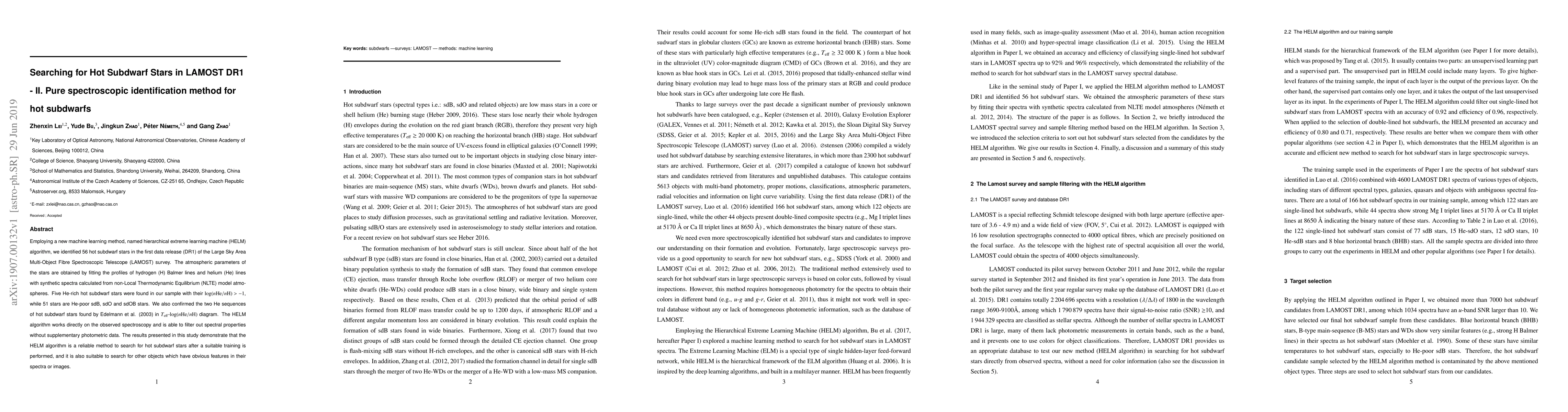 This paper identifies 56 hot subdwarf stars using a new machine learning method called hierarchical extreme learning machine (HELM) in the LAMOST DR1 survey. The HELM algorithm directly analyzes spectroscopic data to classify stars, confirming two He sequences and distinguishing between He-rich and He-poor subdwarfs.