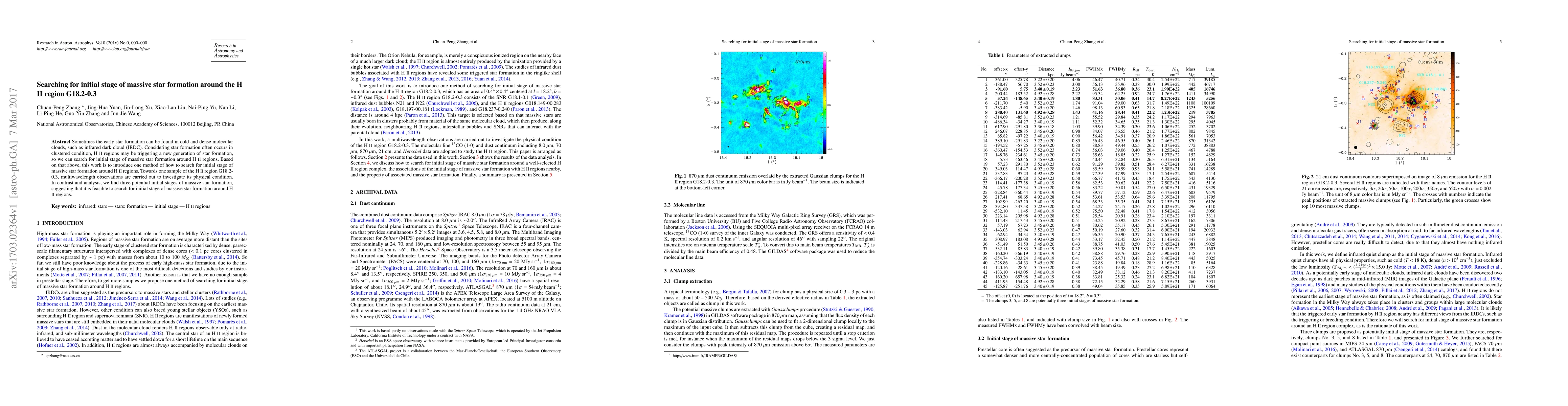 This paper investigates the initial stage of massive star formation around the HII region G18.2-0.3 using multiwavelength observations. The study identifies three potential sites of early massive star formation, demonstrating the feasibility of searching for such stages near HII regions.