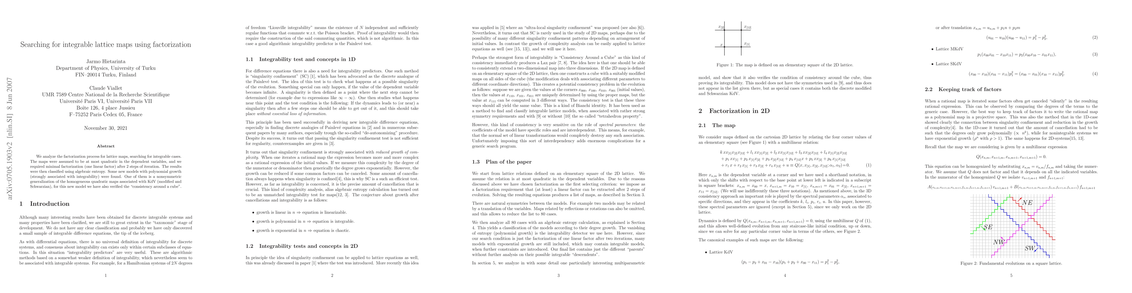 We analyze the factorization process for lattice maps, searching for integrable cases. The maps were assumed to be at most quadratic in the dependent variables, and we required minimal factorization (one linear factor) after 2 steps of iteration. The results were then classified using algebraic entropy. Some new models with polynomial growth (strongly associated with integrability) were found. One of them is a nonsymmetric generalization of the homogeneous quadratic maps associated with KdV (modified and Schwarzian), for this new model we have also verified the "consistency around a cube".