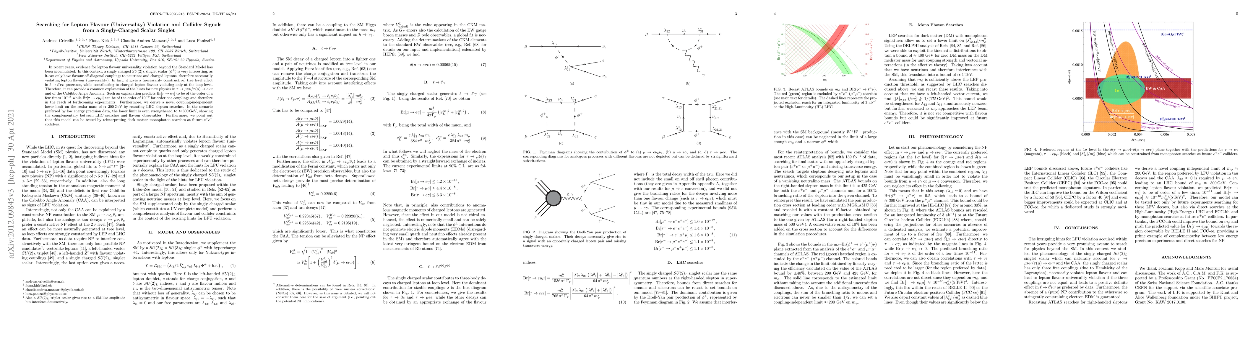 In recent years, evidence for lepton flavour universality violation beyond the Standard Model has been accumulated. In this context, a singly charged $SU(2)_L$ singlet scalar ($\phi^\pm$) is very interesting, as it can only have flavour off-diagonal couplings to neutrinos and charged leptons, therefore necessarily violating lepton flavour (universality). In fact, it gives a (necessarily constructive) tree-level effect in $\ell\to\ell^\prime\nu\nu$ processes, while contributing to charged lepton flavour violating only at the loop-level. Therefore, it can provide a common explanation of the hints for new physics in $\tau\to\mu\nu\nu/\tau(\mu)\to e\nu\nu$ and of the Cabibbo Angle Anomaly. Such an explanation predicts ${\rm Br }[\tau\to e\gamma]$ to be of the order of a few times $10^{-11}$ while ${ \rm Br}[\tau\to e\mu\mu]$ can be of the order of $10^{-9}$ for order one couplings and therefore in the reach of forthcoming experiments. Furthermore, we derive a {novel} coupling-independent lower limit on the scalar mass of $\approx 200\,$GeV by recasting LHC slepton searches. In the scenario preferred by low energy precision data, the lower limit is even strengthened to $\approx300\,$GeV, showing the complementary between LHC searches and flavour observables. Furthermore, we point out that this model can be tested by reinterpreting DM mono-photon searches at future $e^+e^-$ colliders.