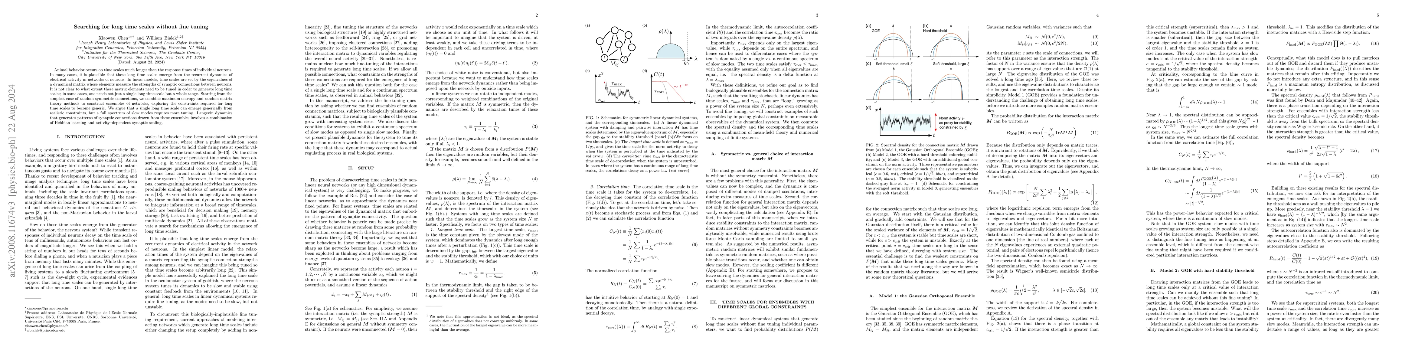 This paper explores how long time scales in animal and human behavior can emerge from the dynamics of neural networks without extensive fine-tuning. It uses random matrix theory and maximum entropy methods to show that while a single long time scale can arise generically, a full spectrum of slow modes requires more precise tuning of synaptic connections.
